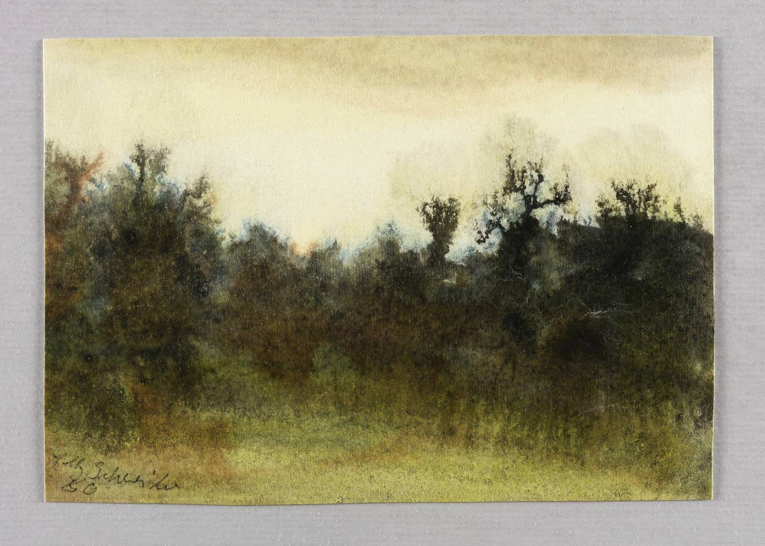 1980. Aquarell, auf hellchamois Aquarellkarton. – Originale Künstlergrafik, von Elly Schreiter. – Unikat. – 12,9 x 18,4 cm (Darstellung / Blatt).