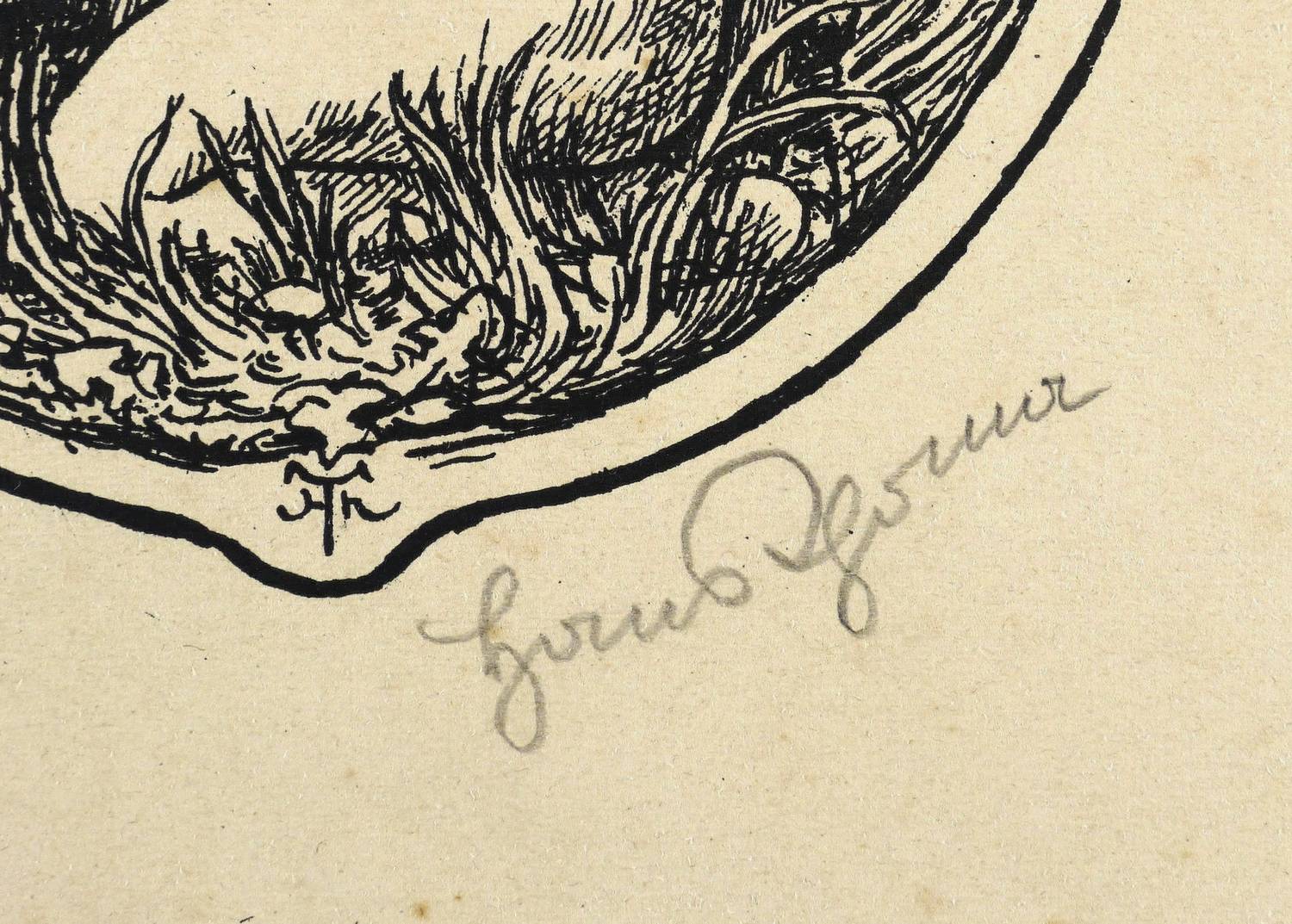 Rechts unten in Bleistift signiert: ″Hans Thoma″. Im Stein im Zierrahmen unten Monogramm: ″HTh″. – Papier altersbedingt wohl gedunkelt. Durchgehend etwas fleckig, Eiseneinschluss. Mäßig guter Zustand.