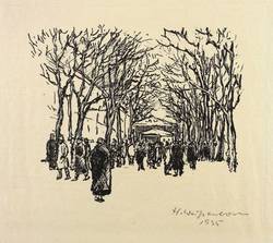 1935. Lithografie / Federlithografie, partiell geschabt, in Schwarz, auf feinem gelbem Bütten. – Originale Künstlergrafik, von Hellmuth Weißenborn. – 9,5 x 11,3 cm (Darstellung / Druckbild), 19 x 23 cm (Blatt).