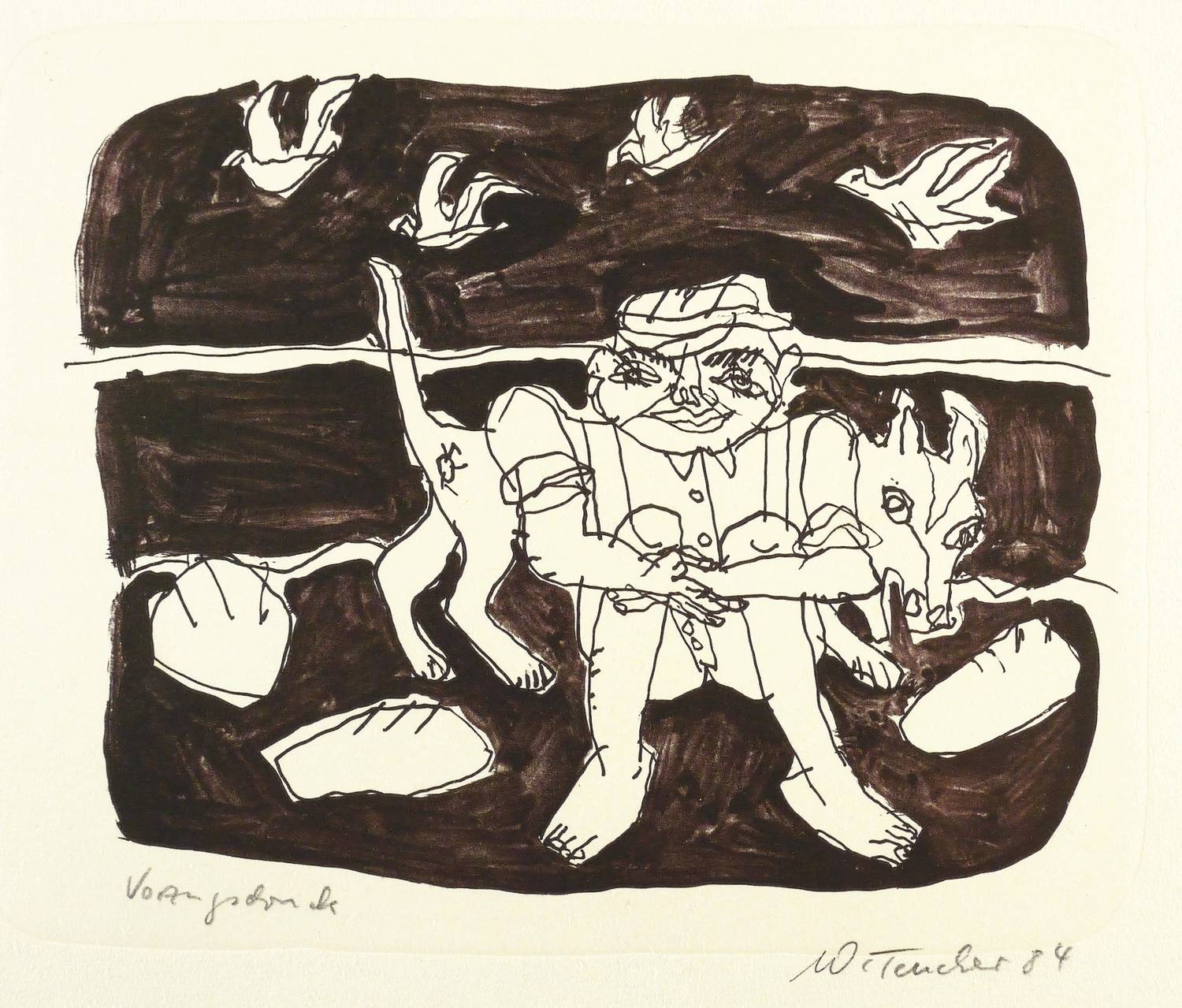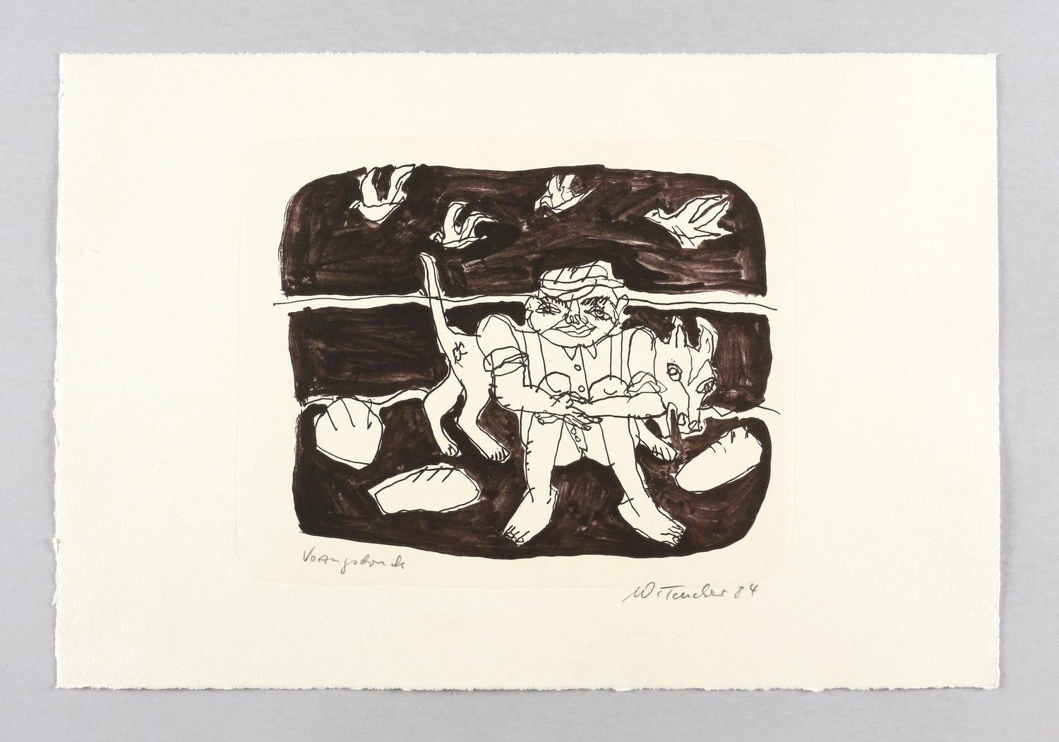 1984. Lithografie / Feder- & Pinsellithografie, in Schwarzbraun, auf weichem chamois Velin. – Originale Künstlergrafik, von Wolfgang Teucher. – Vorzugsdruck. – 19,0 x 24,1 cm (Darstellung / Druckbild), 31 x 45 cm (Blatt).