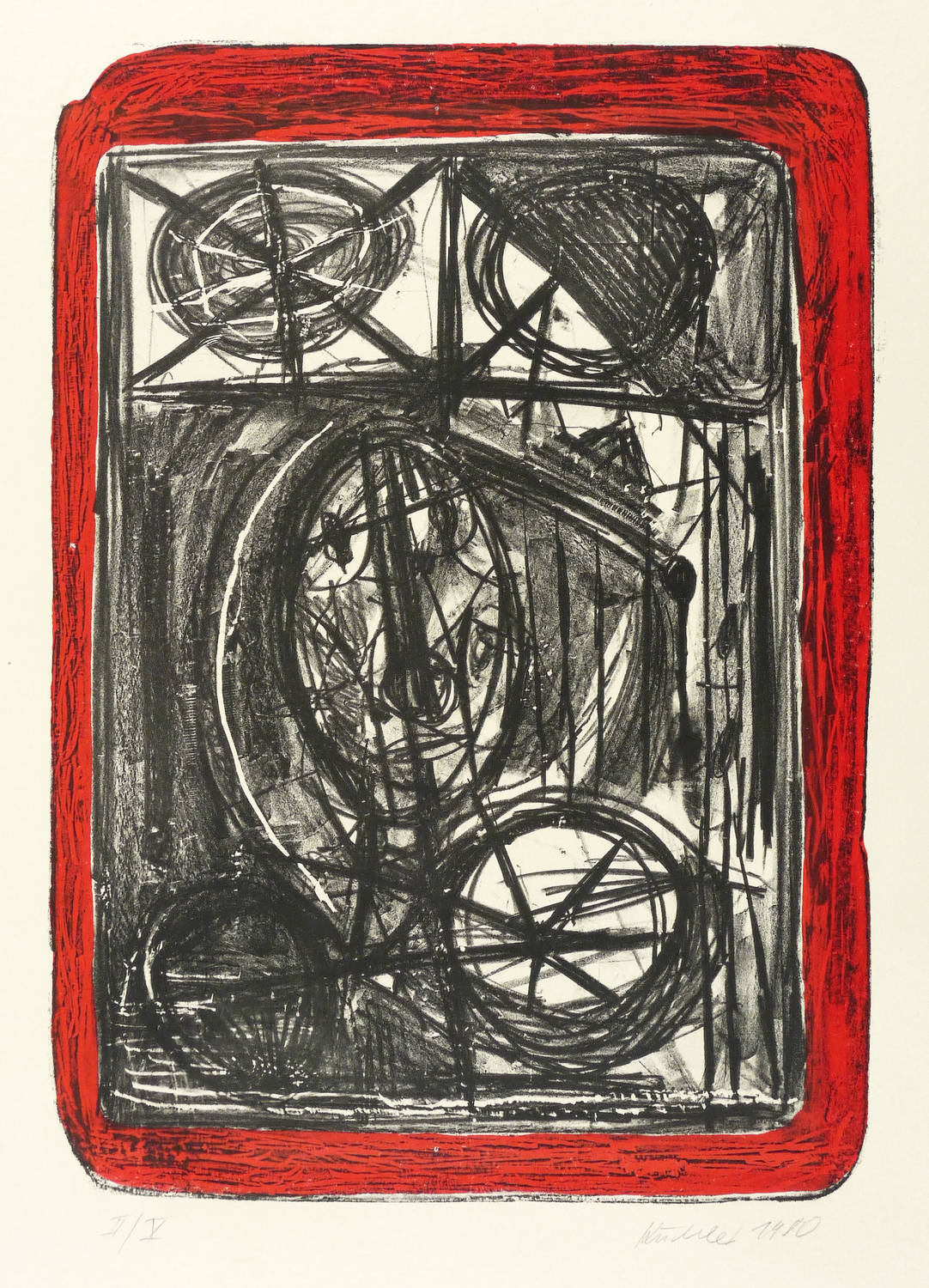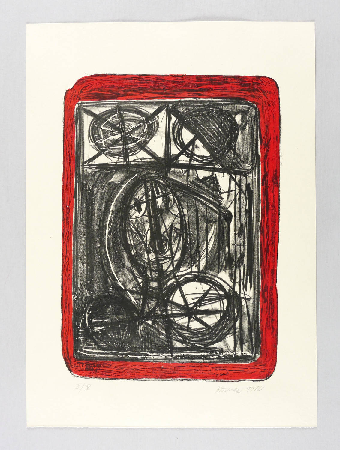 1980. Farblithografie / Kreide- & Pinsellithografie, in Rot & Schwarz, auf glattem festem chamois Velin. – Originale Künstlergrafik, von Andreas Küchler. – Auflage Exemplar Nr. II/V. – 38,0 x 27,0 cm (Darstellung / Druckbild), 50 x 36 cm (Blatt).
