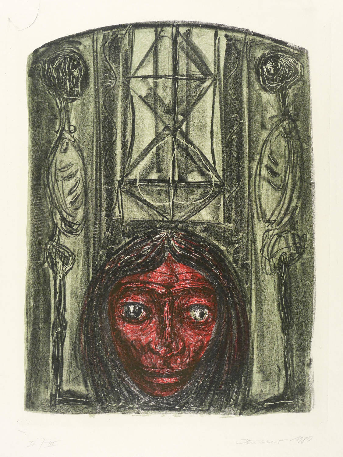 1980. Farblithografie / Kreide- & Pinsellithografie, partiell geschabt, in Rot & Schwarzgrün, auf festem chamois Velin. – Originale Künstlergrafik, von Andreas Küchler. – Auflage Exemplar Nr. II/III. – 39,0 x 28,7 cm (Darstellung / Druckbild), 51 x 37 cm (Blatt).