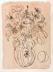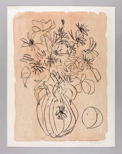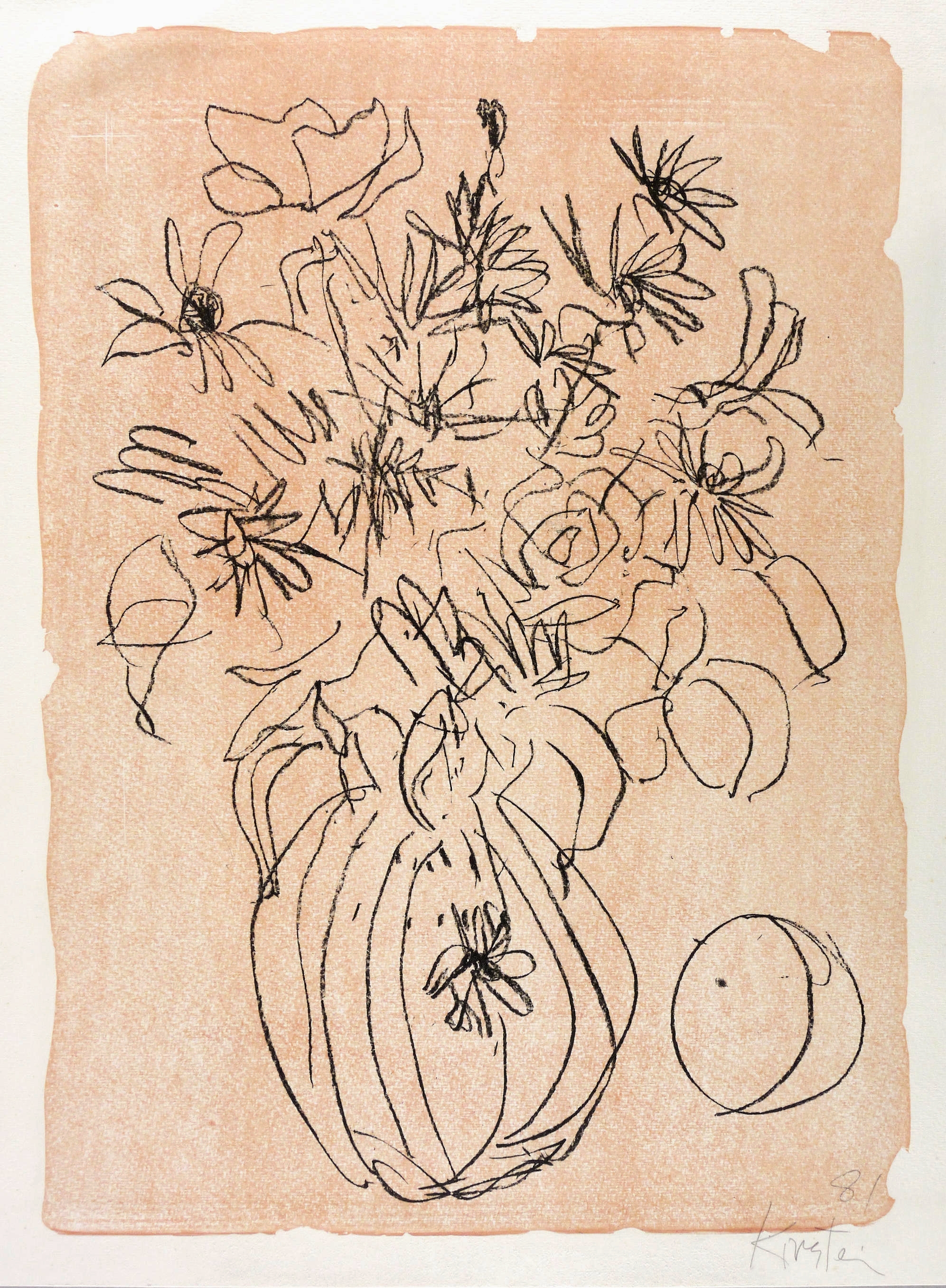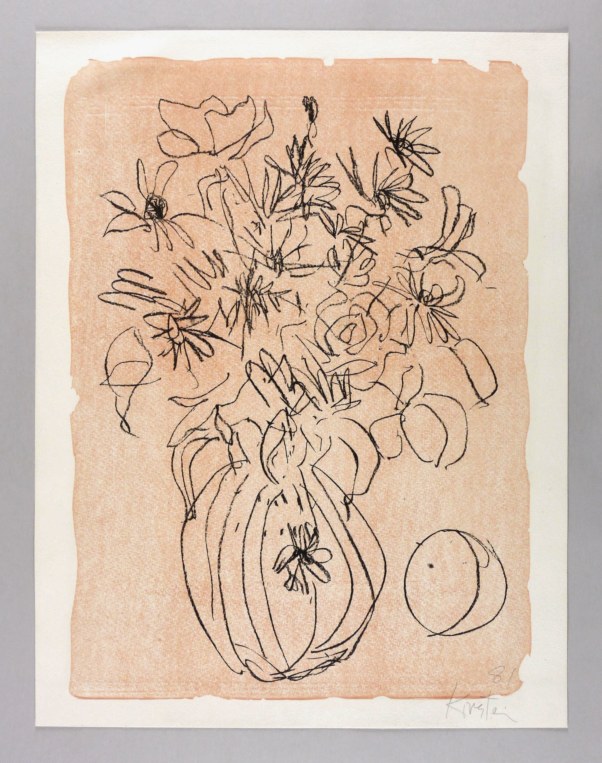 1981. Tonlithografie / Kreidelithografie, in Schwarz, über hellroter Tonplatte, auf chamois Werkdruckpapier. – Originale Künstlergrafik, von Helmut Schmidt-Kirstein. – Druckerexemplar. – 58,3 x 42,2 cm (Darstellung / Tonplatte), 64 x 49 cm (Blatt).