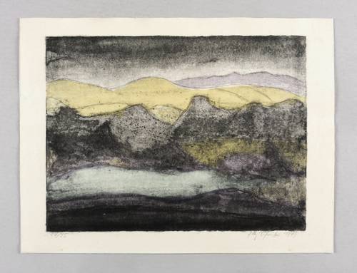 1979. Farblithografie / Pinsellithografie, in 4 Farben, auf gelblichem Velinkarton. – Originale Künstlergrafik, von Elly Schreiter. – Auflage Exemplar Nr. 17/25. – 25,0 x 33,2 cm (Darstellung / Druckbild), 31 x 40 cm (Blatt).