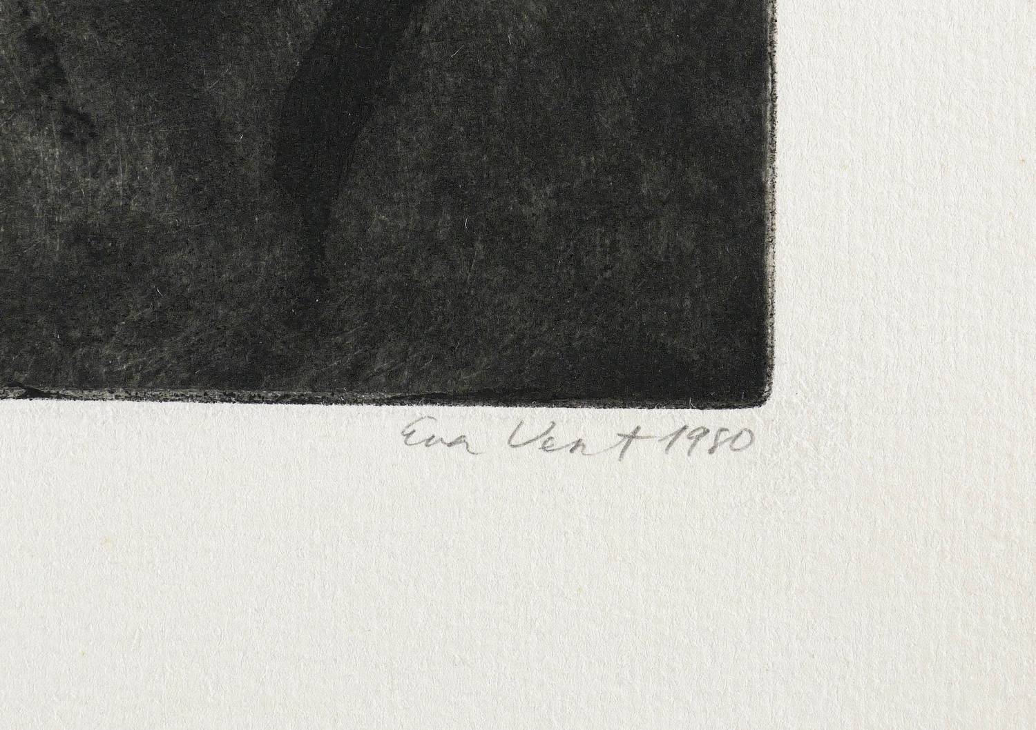 1980. Radierung / Strichätzung & Reservage, in Schwarz, auf hartem hellchamois Weißenborn. – Originale Künstlergrafik, von Eva Vent. – Auflage Exemplar Nr. 28/200. – 20,8 x 28,2 cm (Darstellung / Platte), 30 x 35 cm (Blatt).