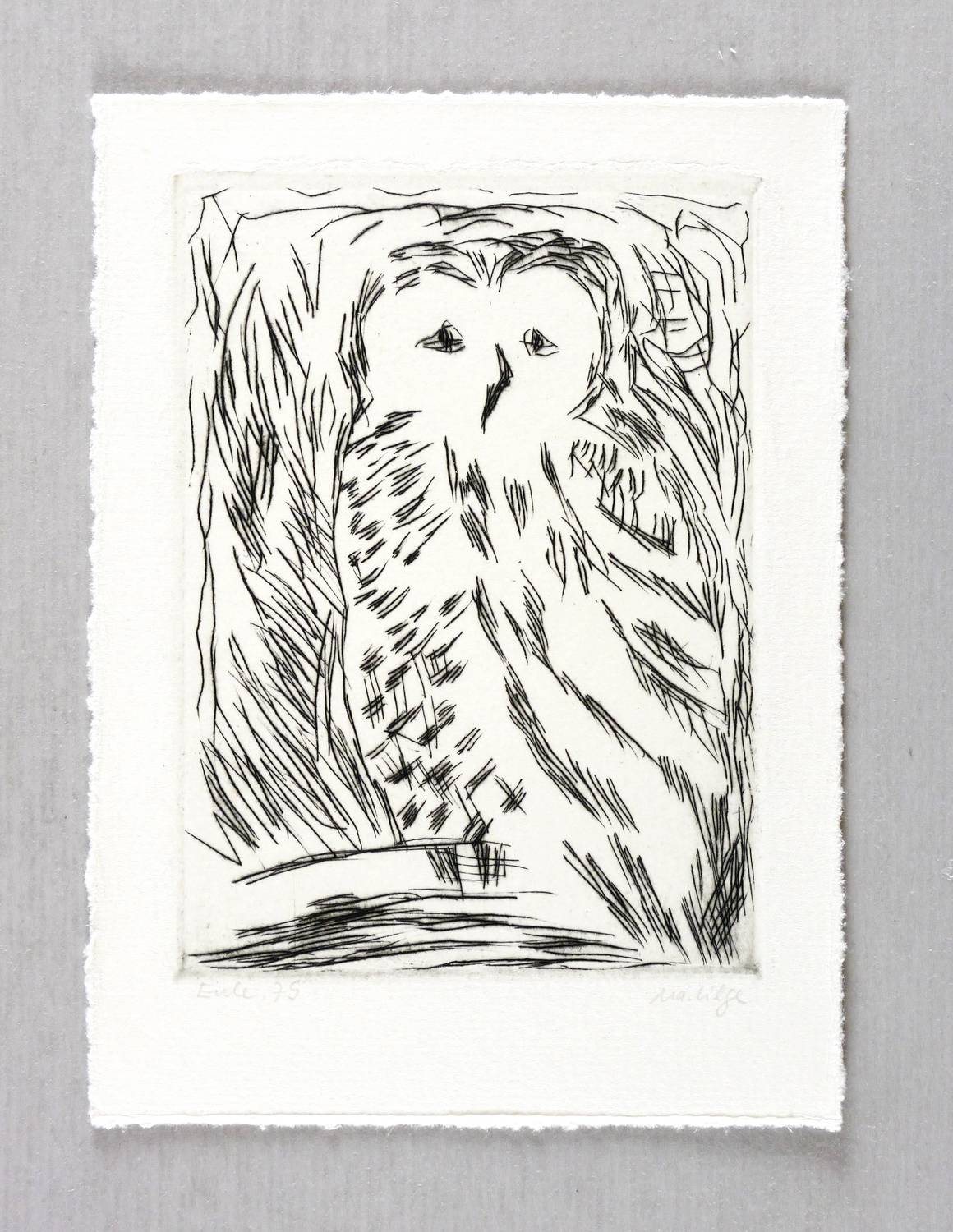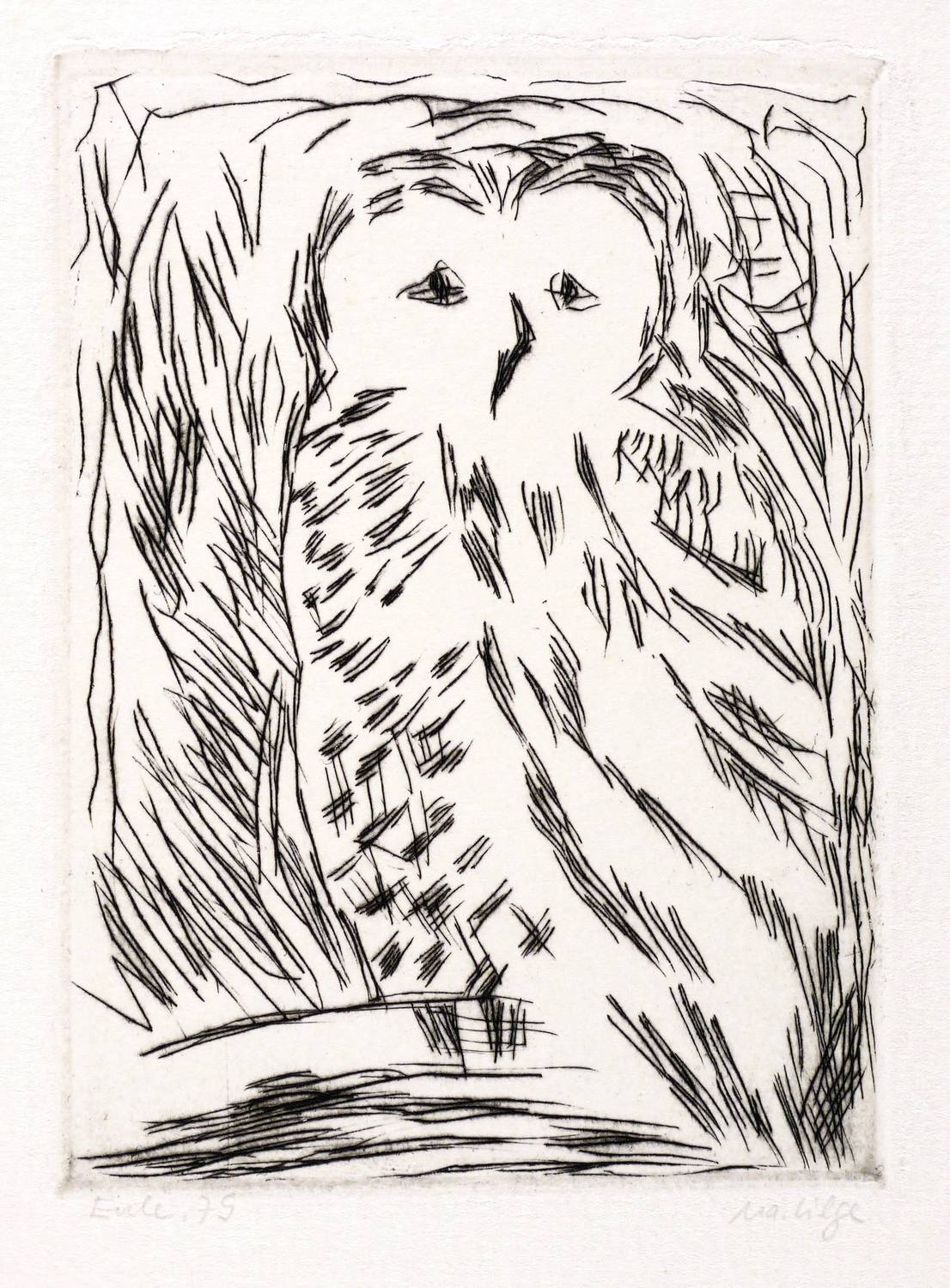 Rechts unten signiert: ″Ma. Lilge″. Links Titel und Jahr: ″Eule 79″. – Sehr guter Zustand.