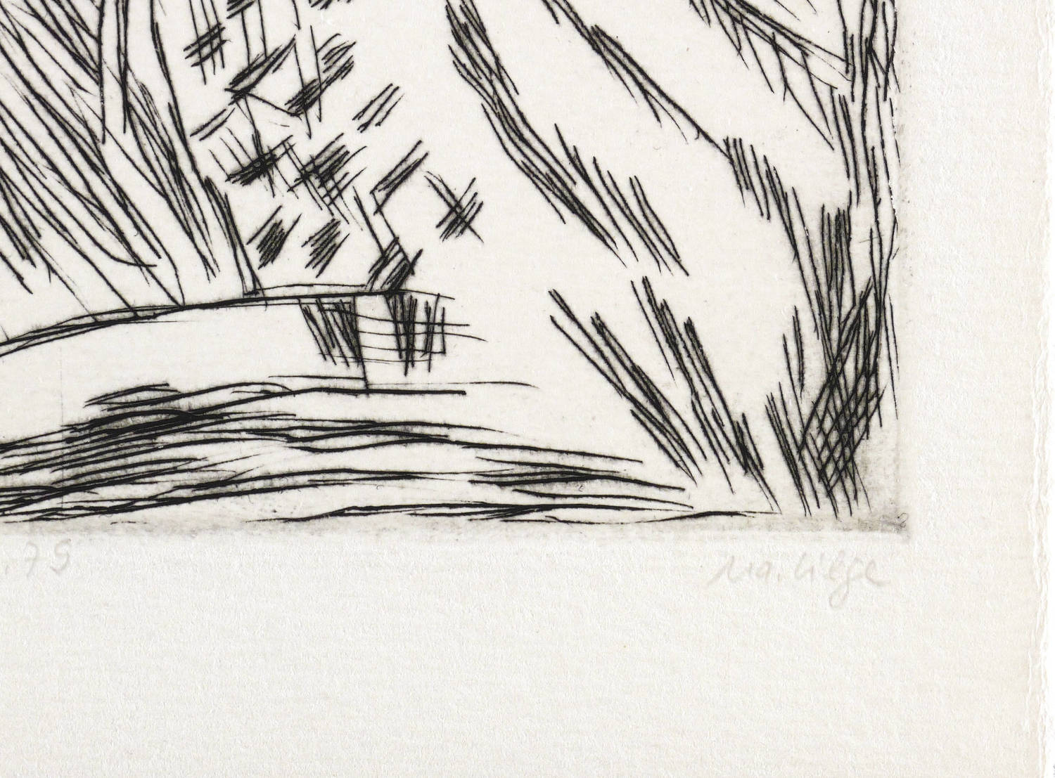 1979. Radierung / Strichätzung, in Schwarz, auf hellchamois Velinkarton. – Originale Künstlergrafik, von Marlis Lilge. – 12,6 x 9,0 cm (Darstellung / Platte), 16 x 12 cm (Blatt).