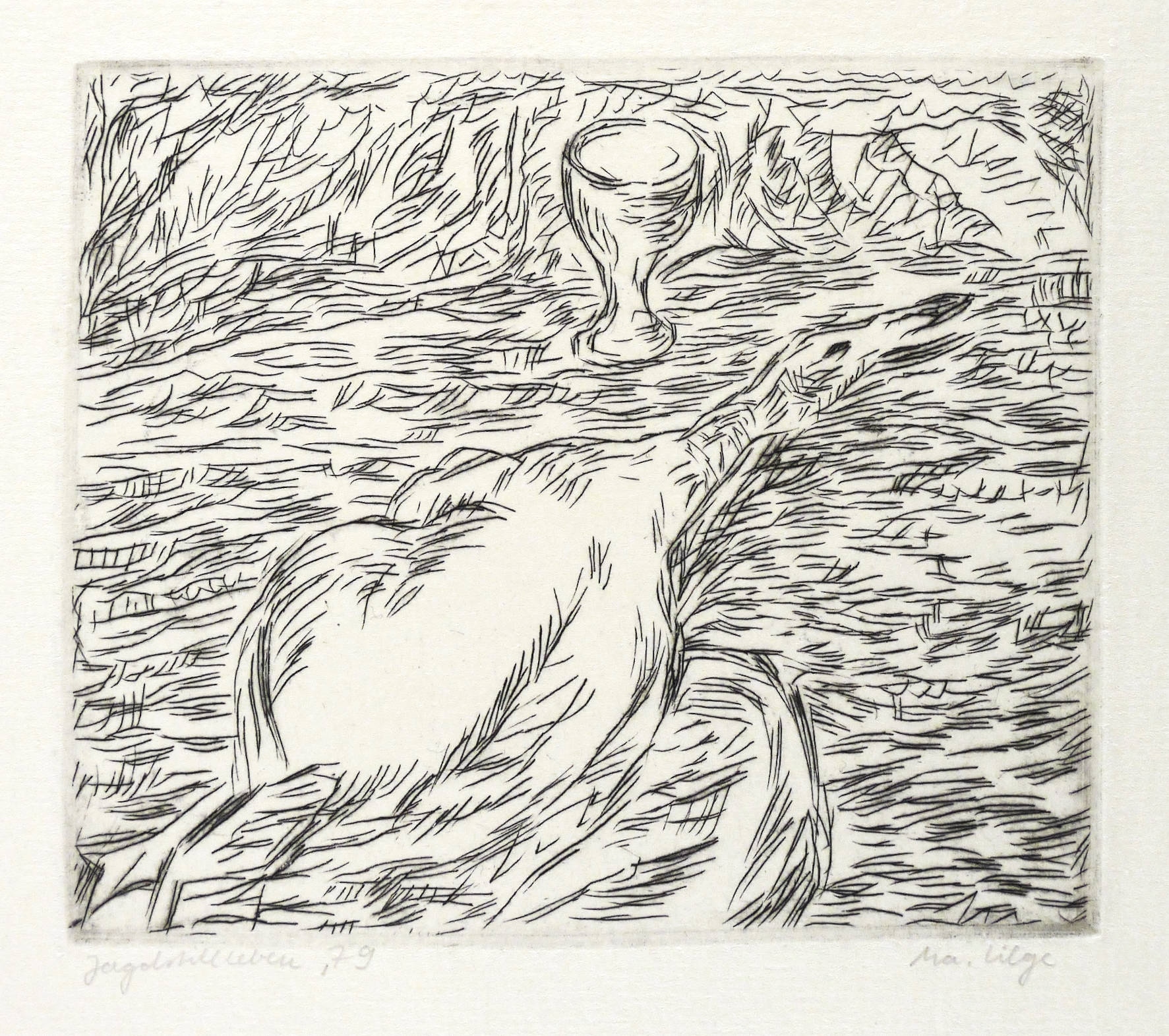 1979. Radierung / Strichätzung, in Schwarz, auf hellchamois Velinkarton. – Originale Künstlergrafik, von Marlis Lilge. – 11,0 x 13,0 cm (Darstellung / Platte), 33 x 23 cm (Blatt).