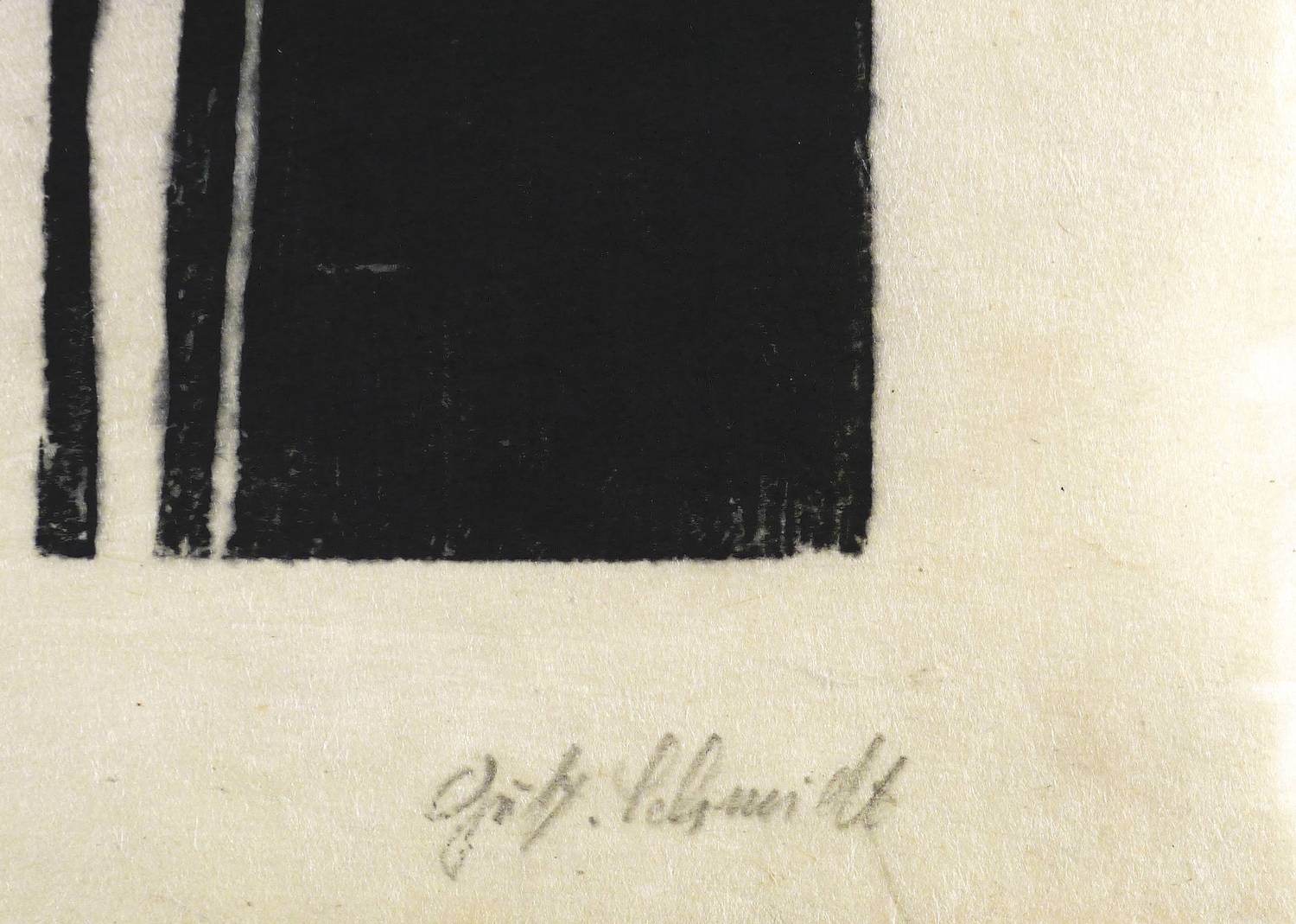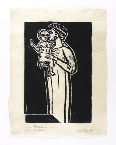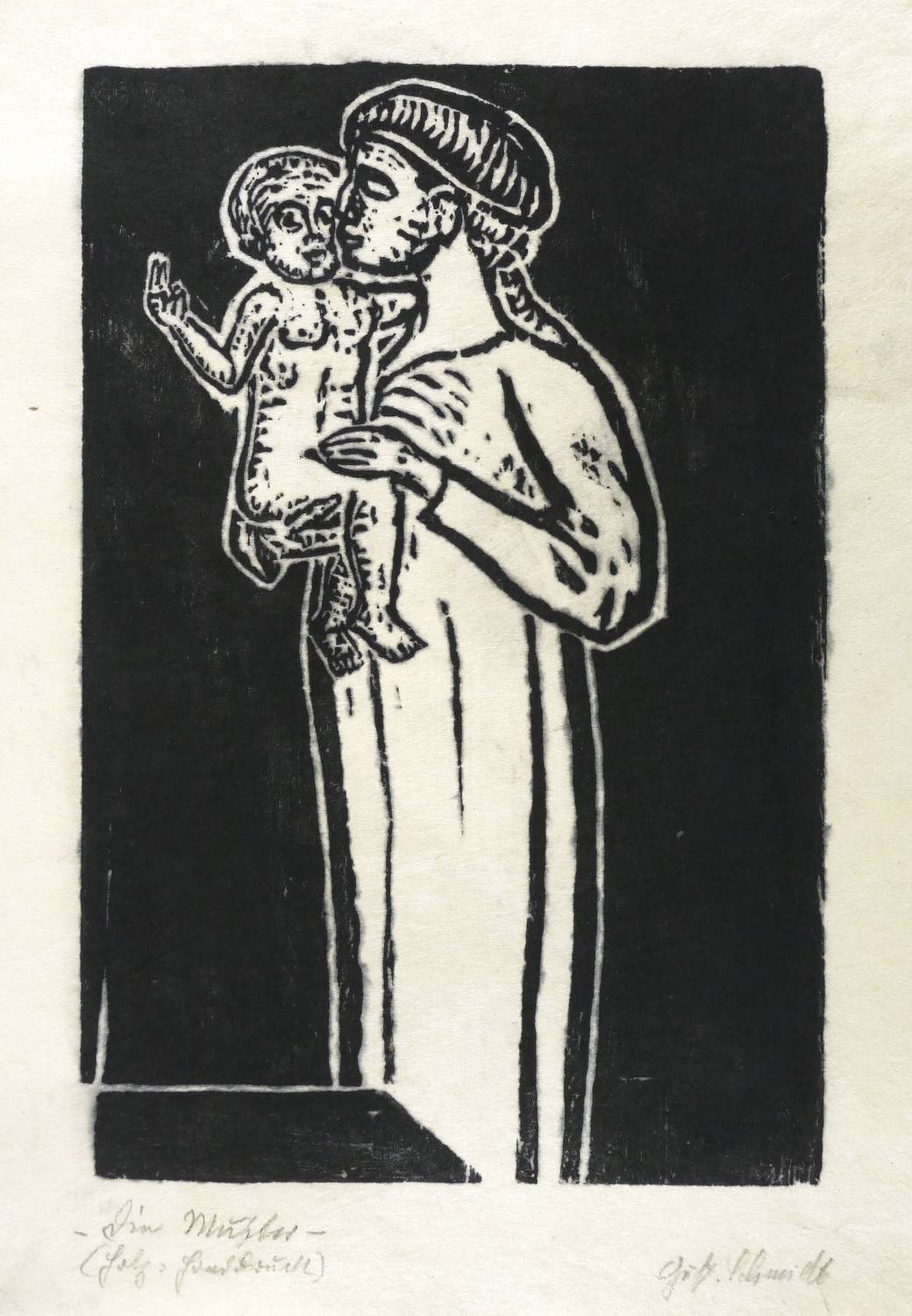 In Bleistift rechts unten signiert: ″Gust. Schmidt″. Links betitelt und bezeichnet: ″Die Mutter (Holz-Handdruck)″. – Provenienz: Sammlung Dr. Ingrid und Prof. Dr. Albrecht Scholz, Dresden. – Sehr guter Zustand.