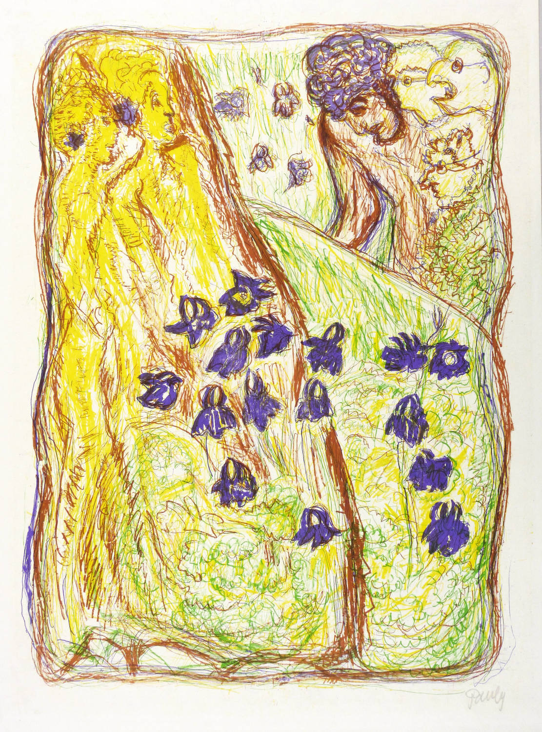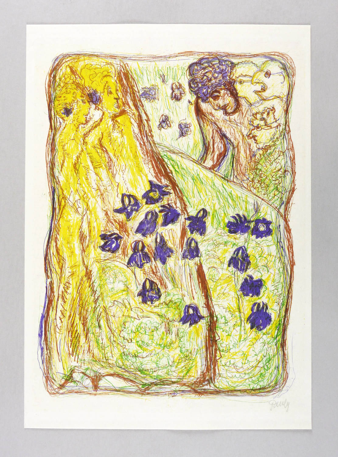 1972/1973. Farbzinkografie / Pinsel- & Kreidezinkografie, in 4 Farben, auf hellchamois Velin. – Originale Künstlergrafik, von Charlotte Elfriede Pauly. – 42,5 x 31,0 cm (Darstellung), 49 x 35 cm (Blatt).