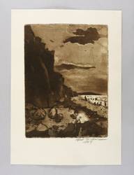 1963. Radierung / Aquatinta & Strichätzung, in Schwarzbraun, auf kräftigem gelbem Velinkarton. – Originale Künstlergrafik, von Alfred Teichmann. – 35,8 x 26,3 cm (Darstellung / Platte), 49 x 35 cm (Blatt).