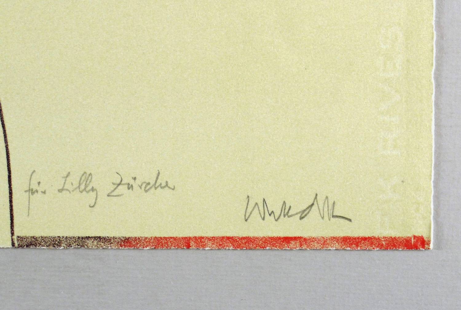 Riediger 496. – Rechts unten in Bleistift signiert: ″Wunderlich″. Links Auflagenbezeichnung: ″e.a.″ Dazu Widmung. Im Stein links teils spiegelverkehrt: ″3.75 P.W.″ Wasserzeichen BFK Rives France. – Druck bei Matthieu in Dielsdorf, Schweiz, auf der berühmten Steindruckpresse Johannisberg 1911. – Eines von 7 Künstlerexemplaren zu einer Auflage von 100 nummerierten und signierten Exemplaren. – Randloser Druck. – Sehr guter Zustand.