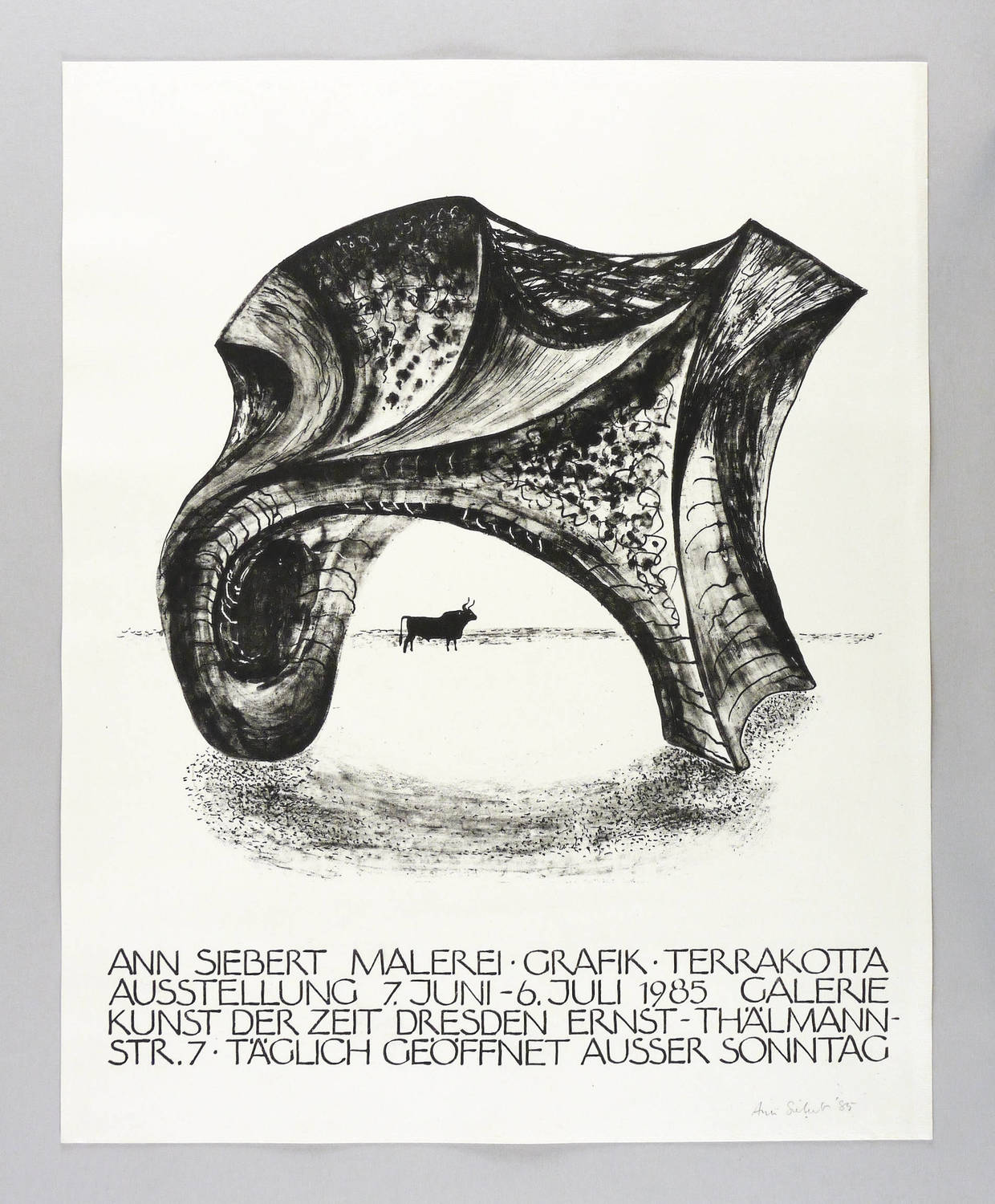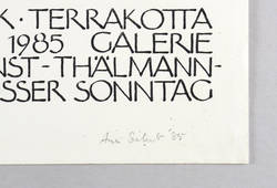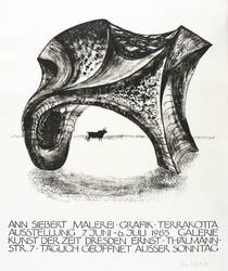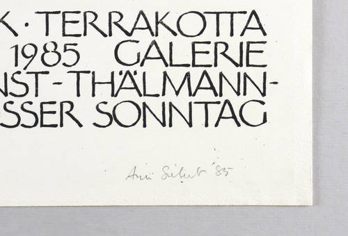 Rechts unten in Bleistift signiert und datiert: ″Ann Siebert 85″. Diverse Inschriften. – Originalgrafisches Plakat zur Ausstellung ″Ann Siebert. Malerei, Grafik, Terrakotta″ 7.6.-6.7.1985 in der Galerie Kunst der Zeit in Dresden. – Sehr guter Zustand.