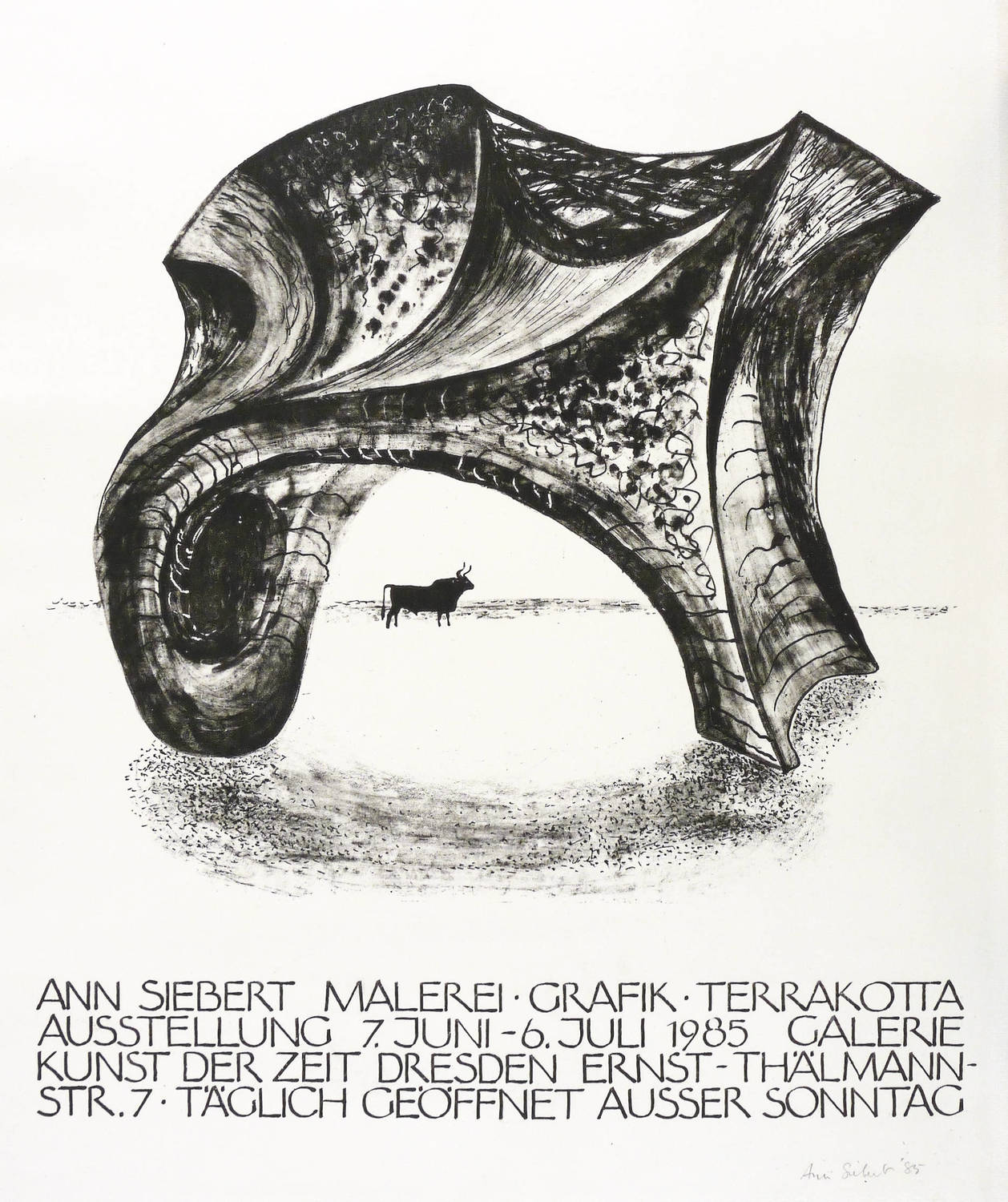 1985. Lithografie / Feder- & Pinsellithografie, in Schwarz, auf hellgelbem Velinkarton. – Originales Künstlerplakat, von Ann Siebert. – 39,8 x 44,3 cm (Darstellung / ohne Schrift), 63 x 51 cm (Blatt).