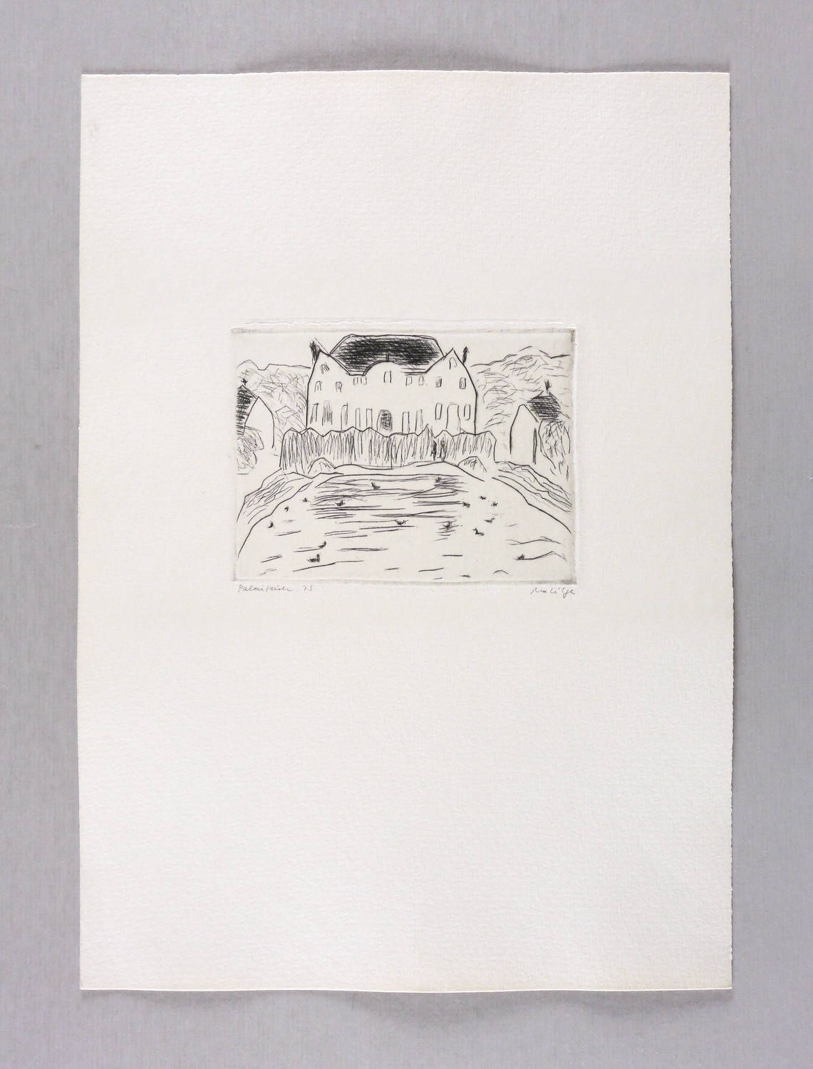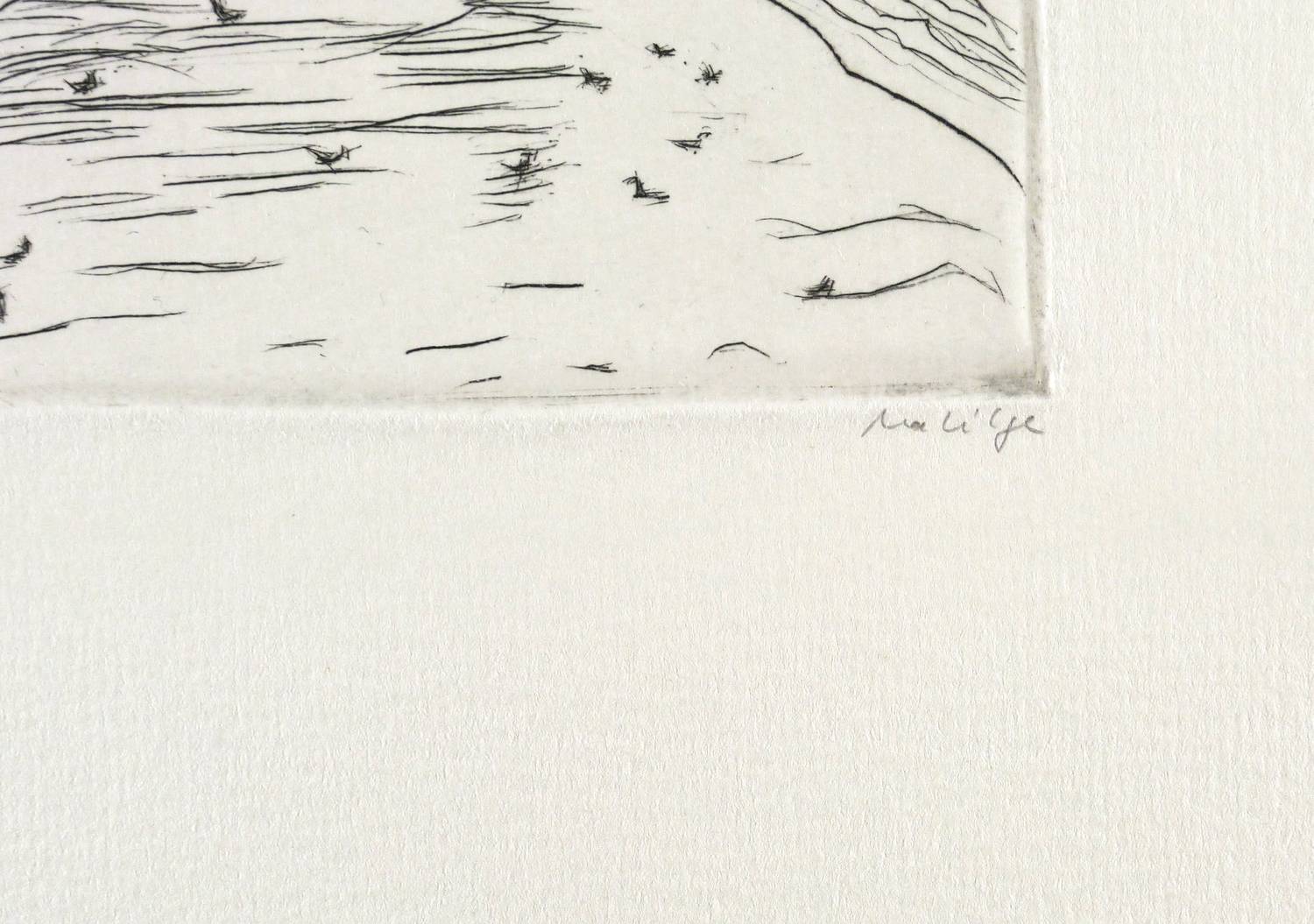 1979. Radierung / Strichätzung, in Schwarz, auf hellchamois Velinkarton. – Originale Künstlergrafik, von Marlis Lilge. – 9,3 x 12,2 cm (Darstellung / Platte), 33 x 23 cm (Blatt).