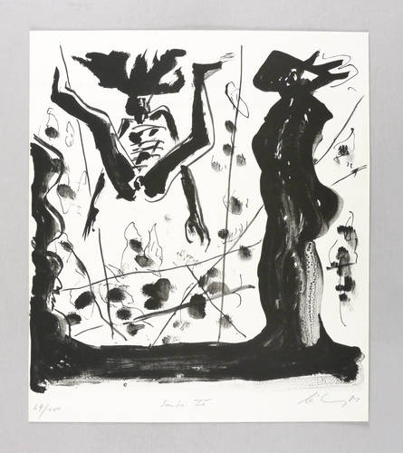 1981. Zinkografie / Kreide- & Pinselzinkografie, in Schwarz, auf hartem hellchamois Weißenborn. – Originale Künstlergrafik, von Helge Leiberg. – Auflage Exemplar Nr. 64/100. – 40 x 35 cm (Blatt), 34,5 x 33,9 cm (Darstellung / Druckbild).