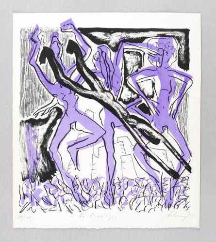 Helge Leiberg (*1954 Dresden, lebt und arbeitet in Berlin). Deutscher Maler und Grafiker. 1971-73 Lehre zum Positiv-Retuscheur und Abendstudium an der Hochschule für Bildende Künste Dresden (HfBK). 1973-78 Studium bei Gerhard Kettner an der HfBK. Danach freiberuflich tätig. Beschäftigung mit Medienkunst. 1979 Gründung einer Malerband mit Michael Freudenberg und A.R. Penck. Beginn der Zusammenarbeit mit dem Gitarristen Lothar Fiedler. Leiberg bemalte auch Super 8-Filme, die später bei Performances auf Tanzende projiziert wurden. 1984 Ausreise und Ansiedlung in West-Berlin. Seit 1994 verstärkt plastische Arbeiten in Terracotta und Bronze. 1990 gründete er die Performance-Gruppe GOKAN mit der Tänzerin Fine Kwiatkowski und den Musikern Lothar Fiedler und Dietmar Diesner.