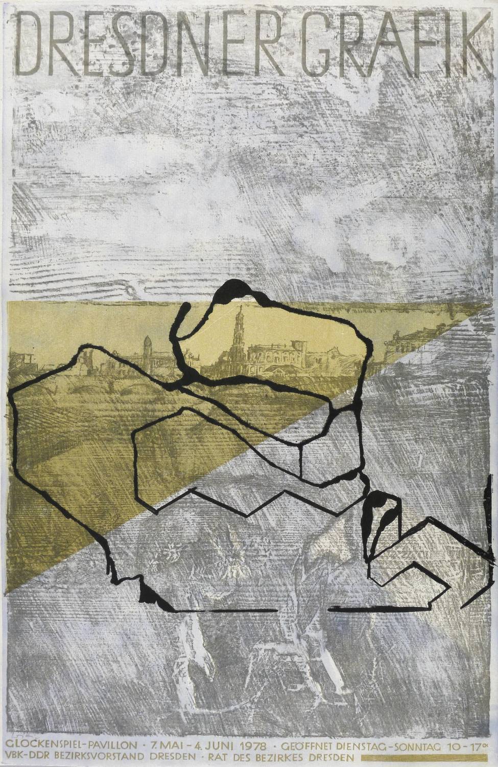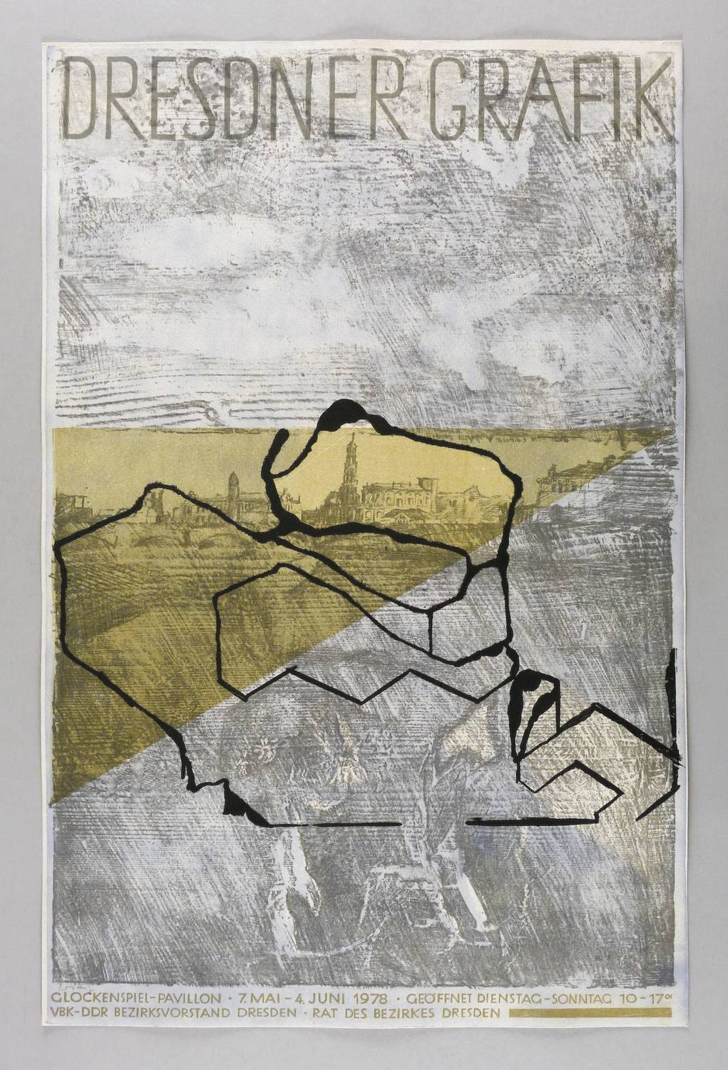 In Bleistift links unten signiert: ″Wittig″. Im Stein diverse Inschriften. – Originalgrafisches Künstlerplakat zur Ausstellung ″Dresdner Grafik″ im Glockenspiel-Pavillon in Dresden 7.5.-4.6.1978. – Nicht bei Muschter. – Sehr guter Zustand.