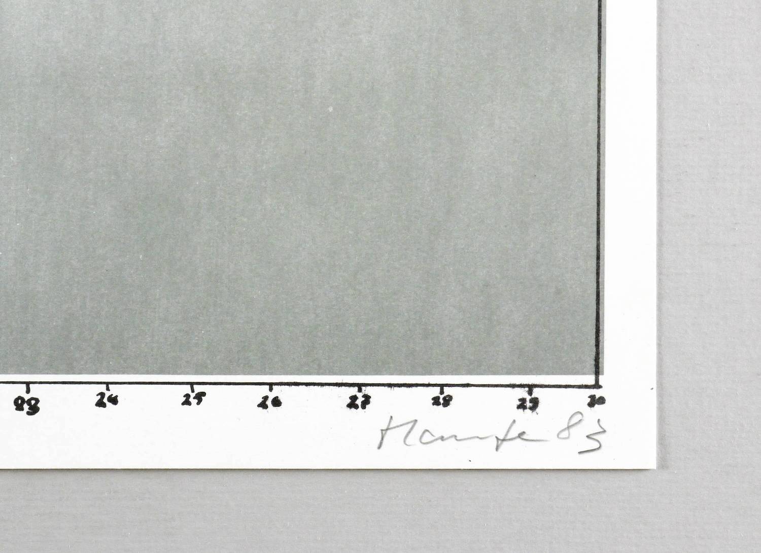 1983. Farbsiebdruck / Farbserigrafie, in Lichtgrau & Schwarz, auf glattem weißem Velinkarton. – Originale Künstlergrafik, von Jürgen Haufe. – Auflage Exemplar Nr. 3/18. – 54 x 62 cm (Blatt), 51,0 x 60,7 cm (Darstellung / Druckbild).