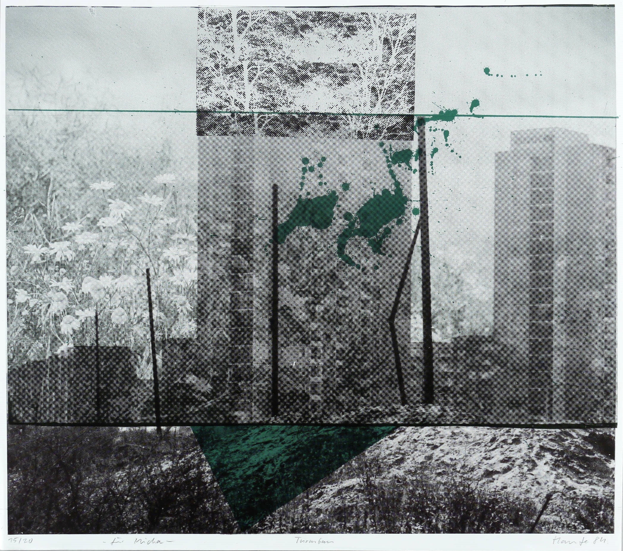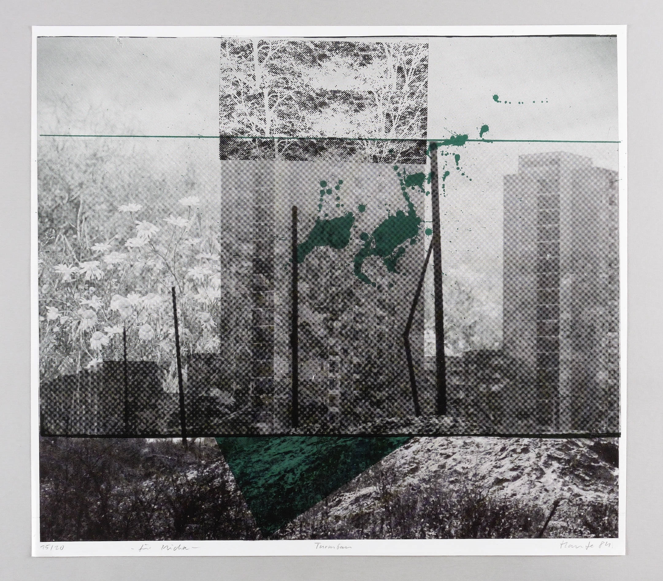1984. Farbsiebdruck / Farbserigrafie, in Grün & Schwarz, auf leichtem weißem Werkdruck. – Originale Künstlergrafik, von Jürgen Haufe. – Auflage Exemplar Nr. 15/20. – 55 x 62 cm (Blatt), 51,9 x 59,8 cm (Darstellung / Druckbild).