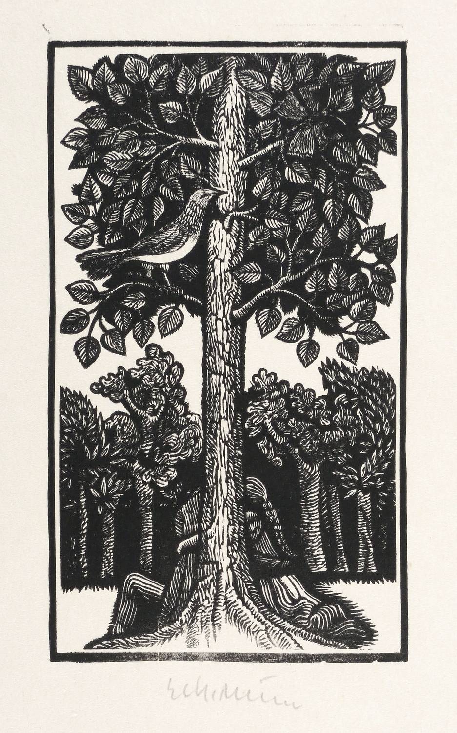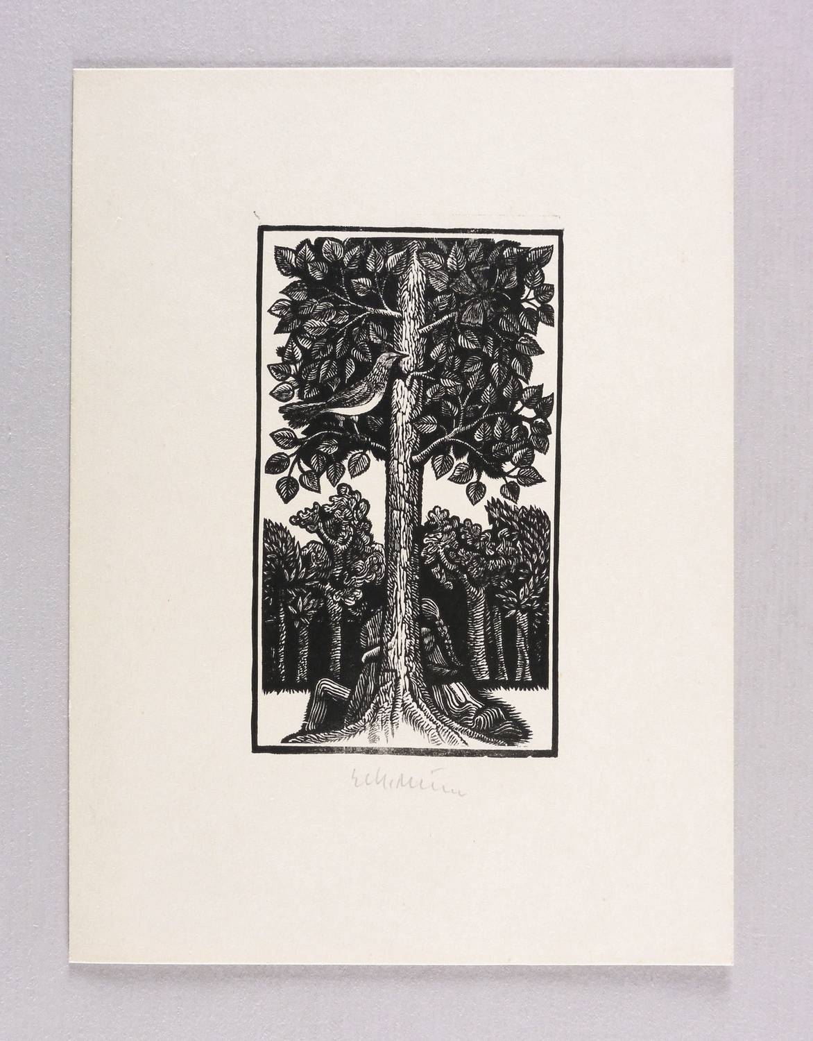 1970-1979. Holzschnitt, in Schwarz, auf glattem hellgelbem Velinkarton. – Originale Künstlergrafik, von Gerhard Kurt Müller. – 11,8 x 6,9 cm (Darstellung / Druckbild), 21 x 15 cm (Blatt).