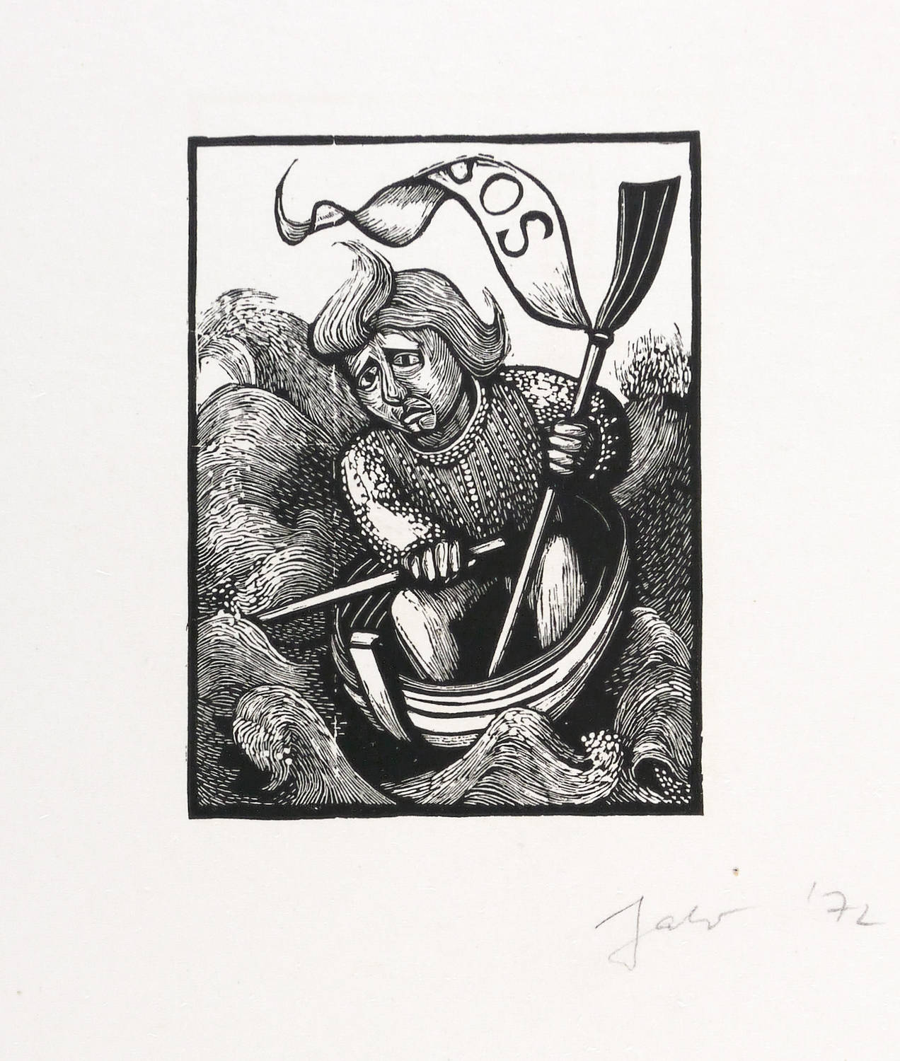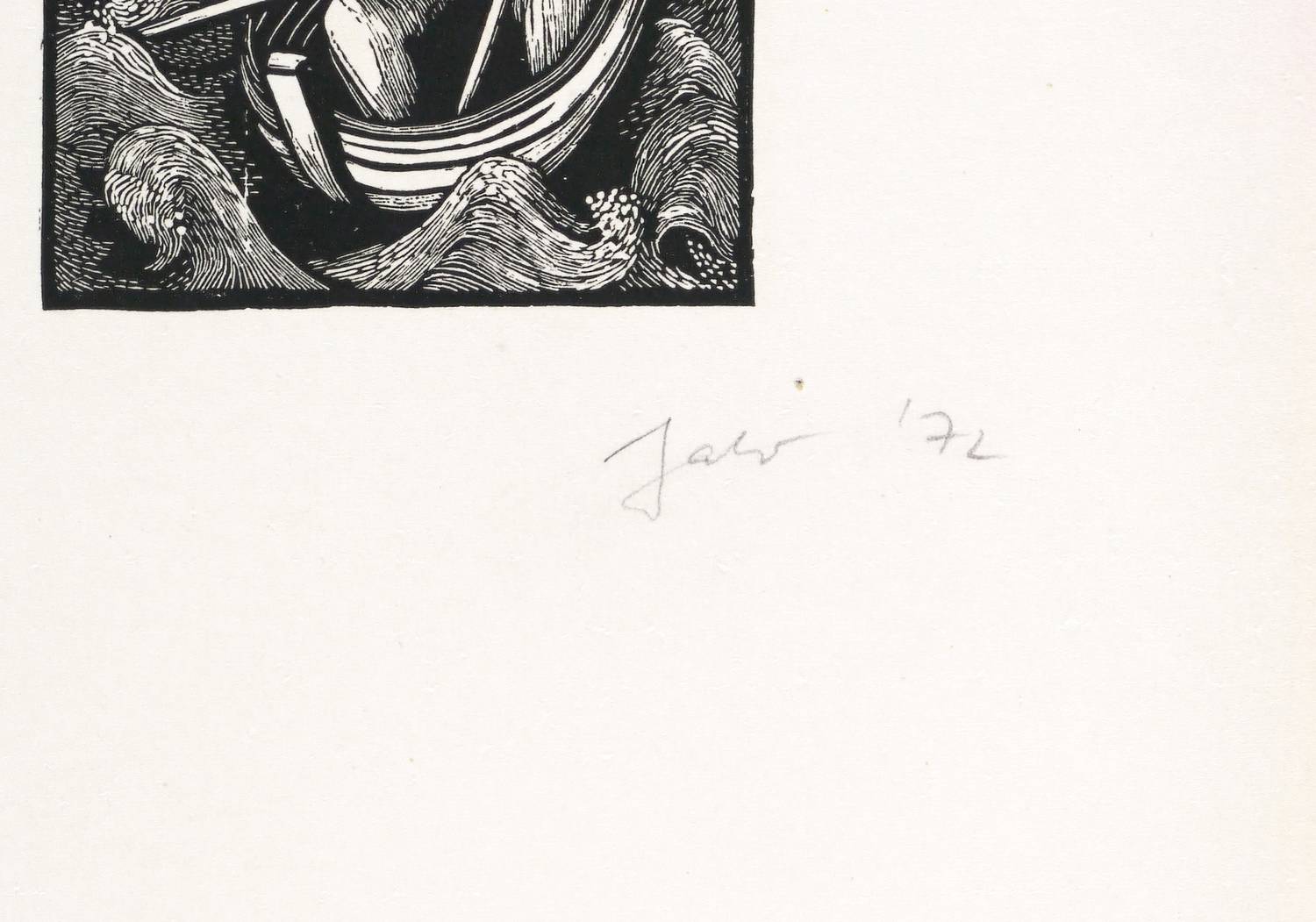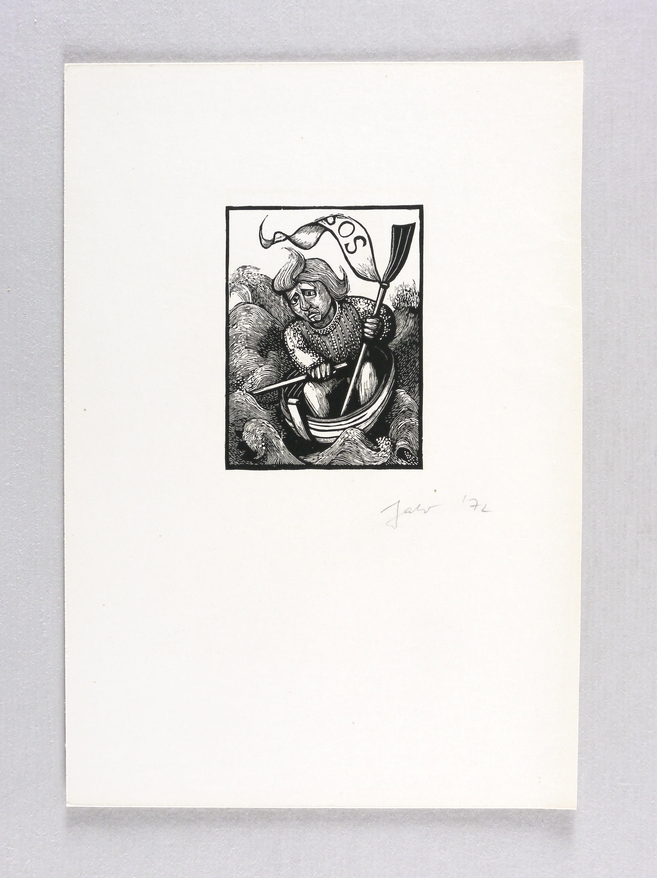 1972. Holzschnitt, in Schwarz, auf glattem hellchamois Karton. – Originale Künstlergrafik, von Christa Jahr. – 7,4 x 5,5 cm (Darstellung / Druckbild), 21 x 15 cm (Blatt).