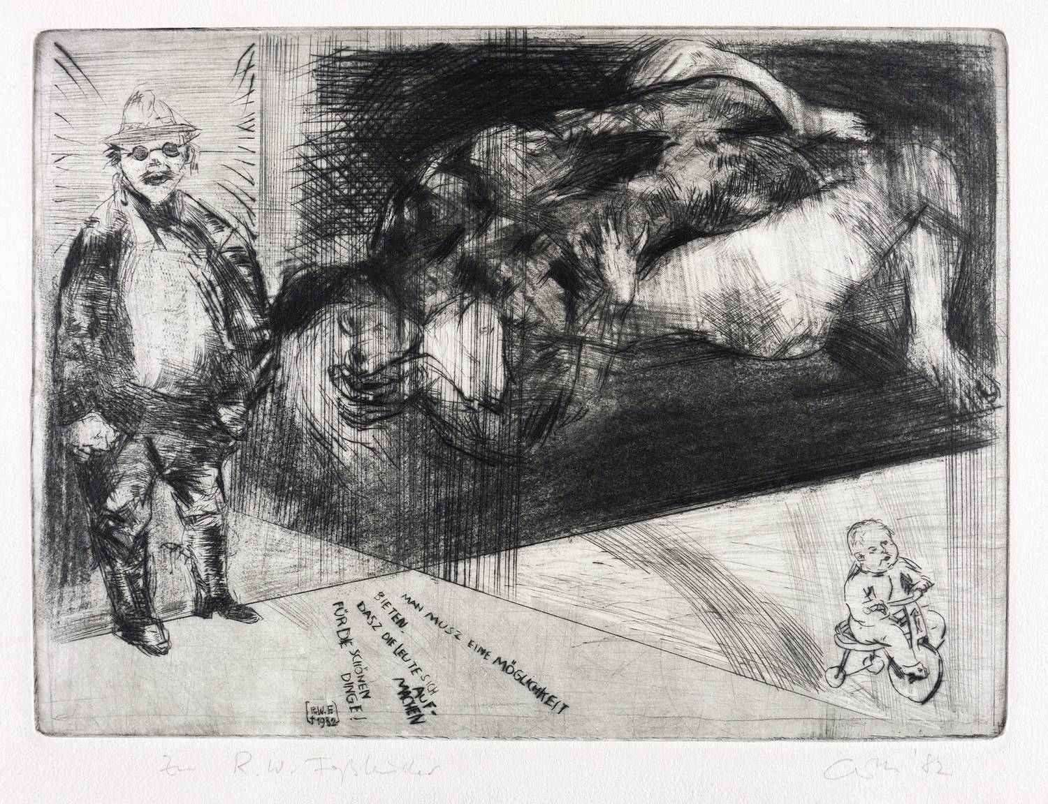 Rechts unten in Bleistift signiert und datiert: ″Gille '82″. Links Titel: ″Zu R.W. Faßbinder″. In der Platte links unten Inschrift: ″MAN ;USZ EINE MÖGLICHKEIT BIETEN, DASZ DIE LEUTE SICH AUFMACHEN FÜR DIE SCHÖNEN DINGE! R.W.F + 1982″. – Sehr guter Zustand.