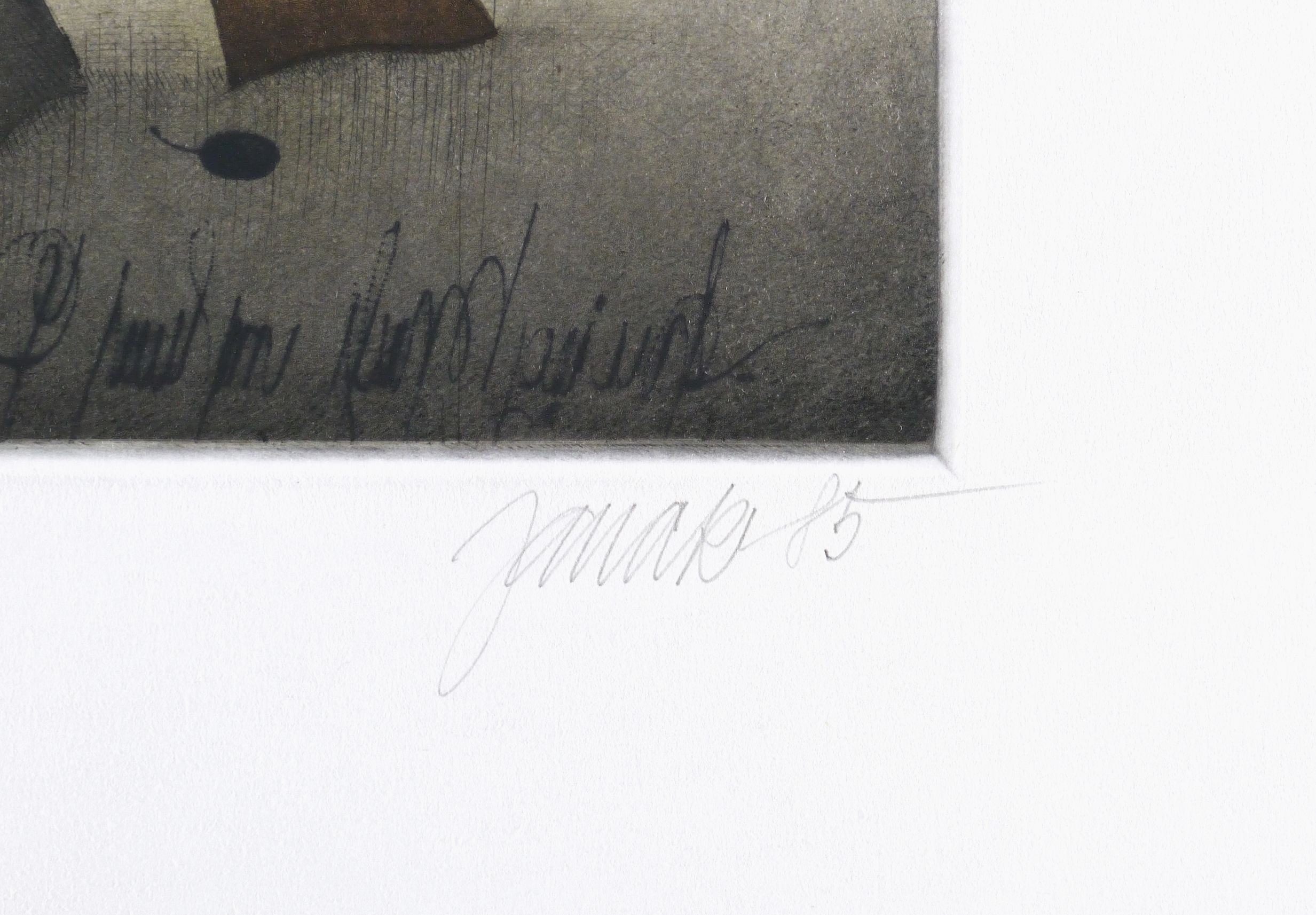 Aus: Jubiläumsmappe II. Farbige Grafik (Leipzig: Galerie am Sachsenplatz 1981). – Rechts unten signiert und datiert: ″Janak 85″. Links Auflagenbezeichnung: ″30/200″. – Sehr guter Zustand.