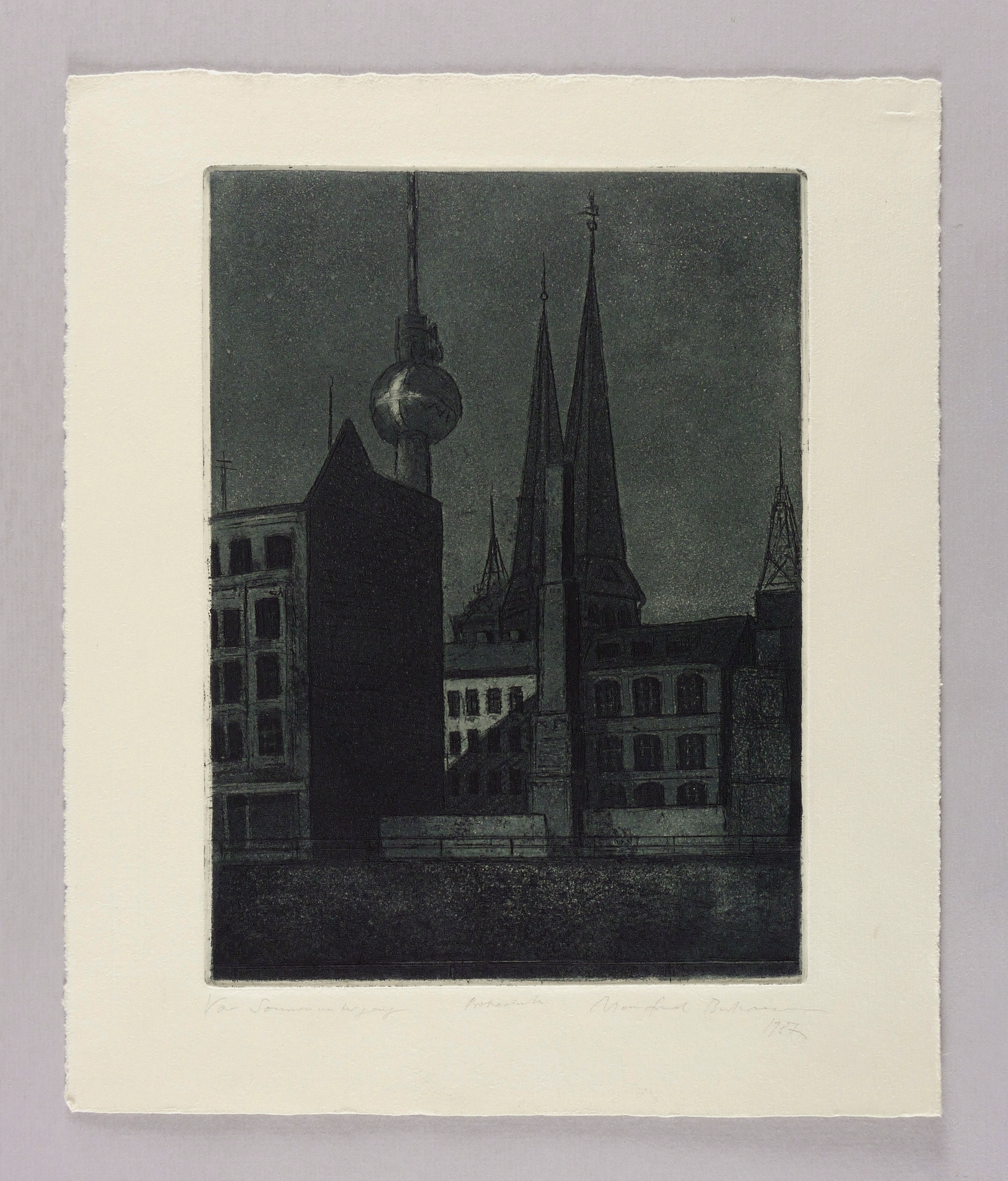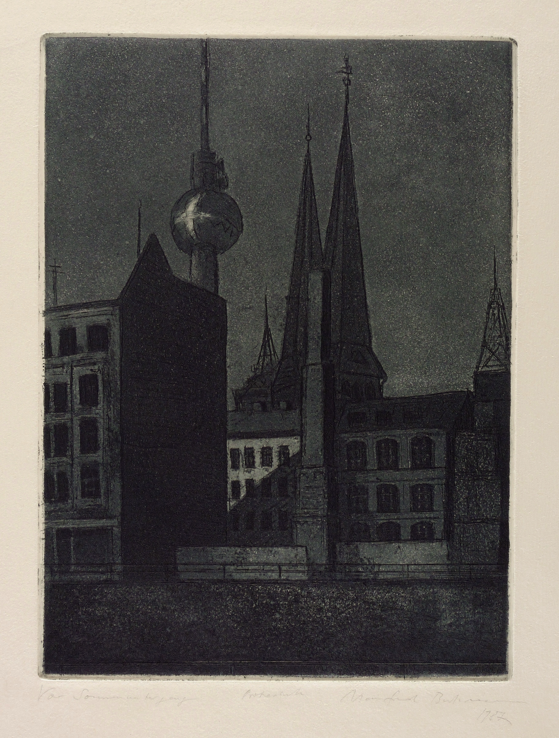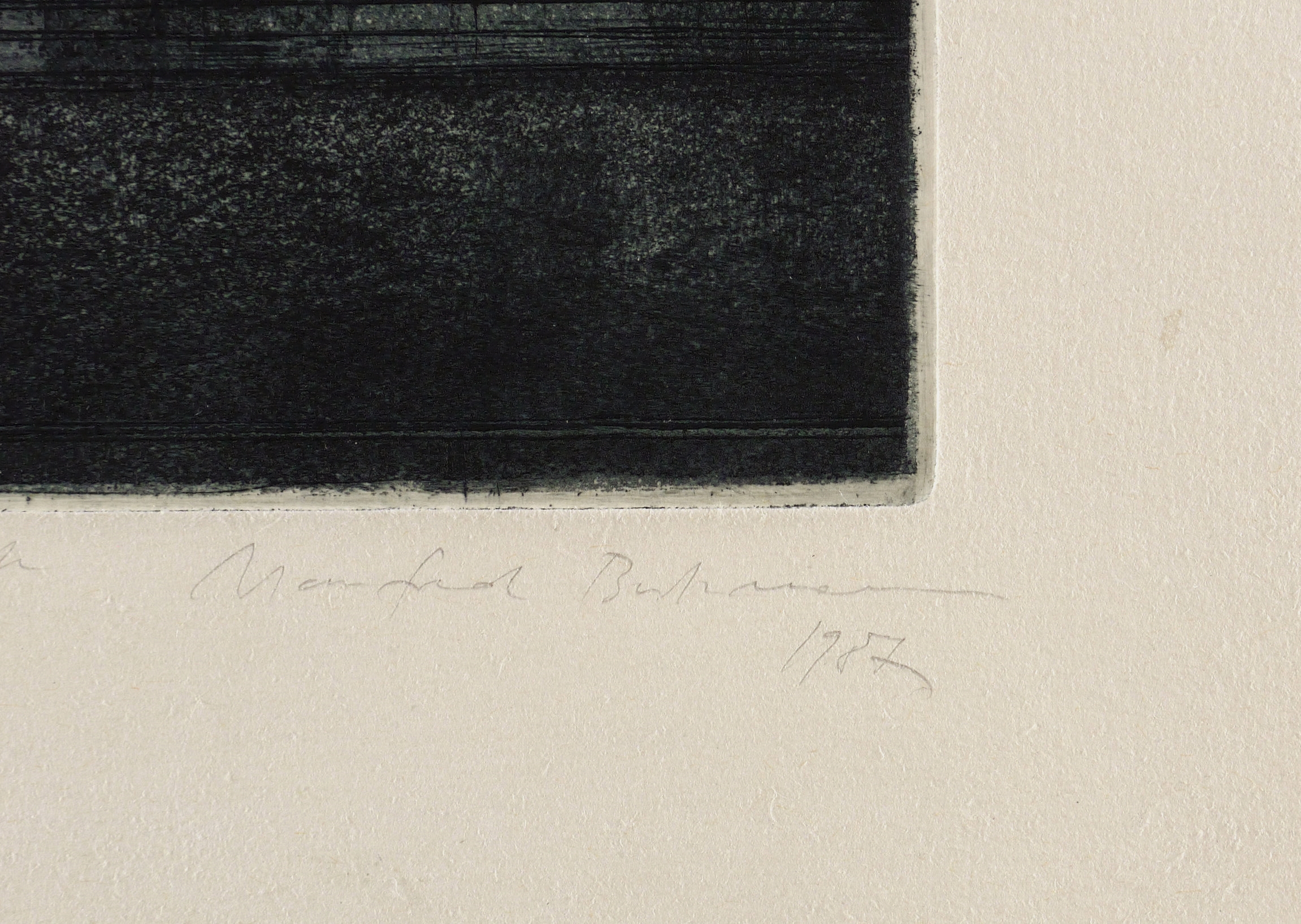 Rechts unten in Bleistift signiert und datiert: ″Manfred Butzmann 1987″. Links bezeichnet: ″Vor Sonnenuntergang″. In der Mitte Auflagenbezeichnung: ″Probedruck″. Wasserzeichen der Hahnemühle. – Seltener Probedruck. – Sehr guter Zustand.
