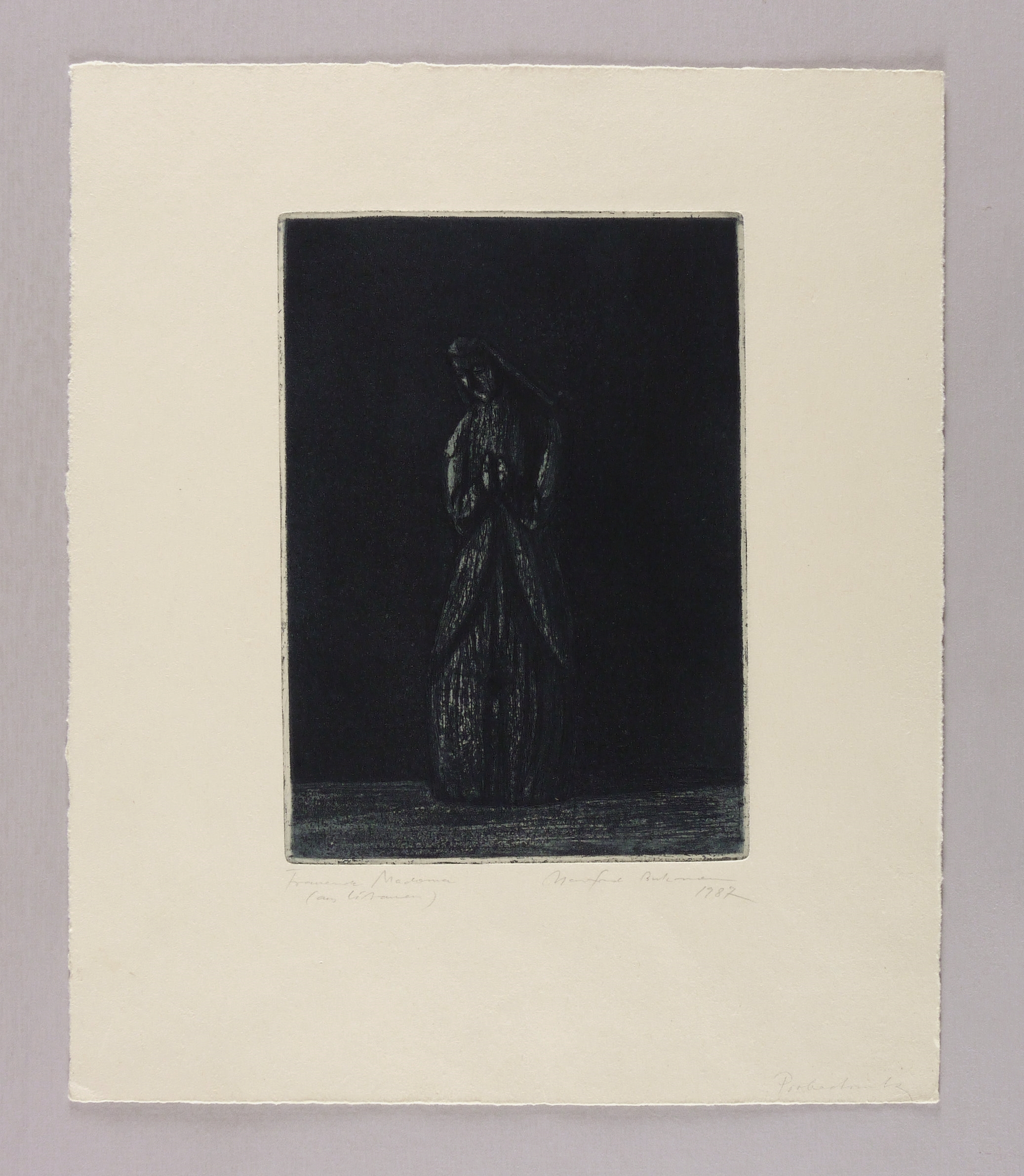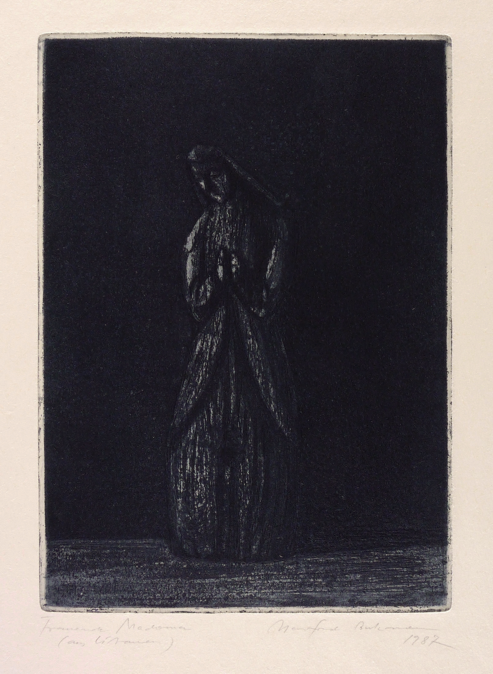 Rechts unten in Bleistift signiert und datiert: ″Manfred Butzmann 1987″. Links Titel: ″Trauernde Madonna (aus Litauen)″. In der Blattecke rechts unten Auflagenbezeichnung: ″Probedruck″. – Seltener Probedruck. – Sehr guter Zustand.