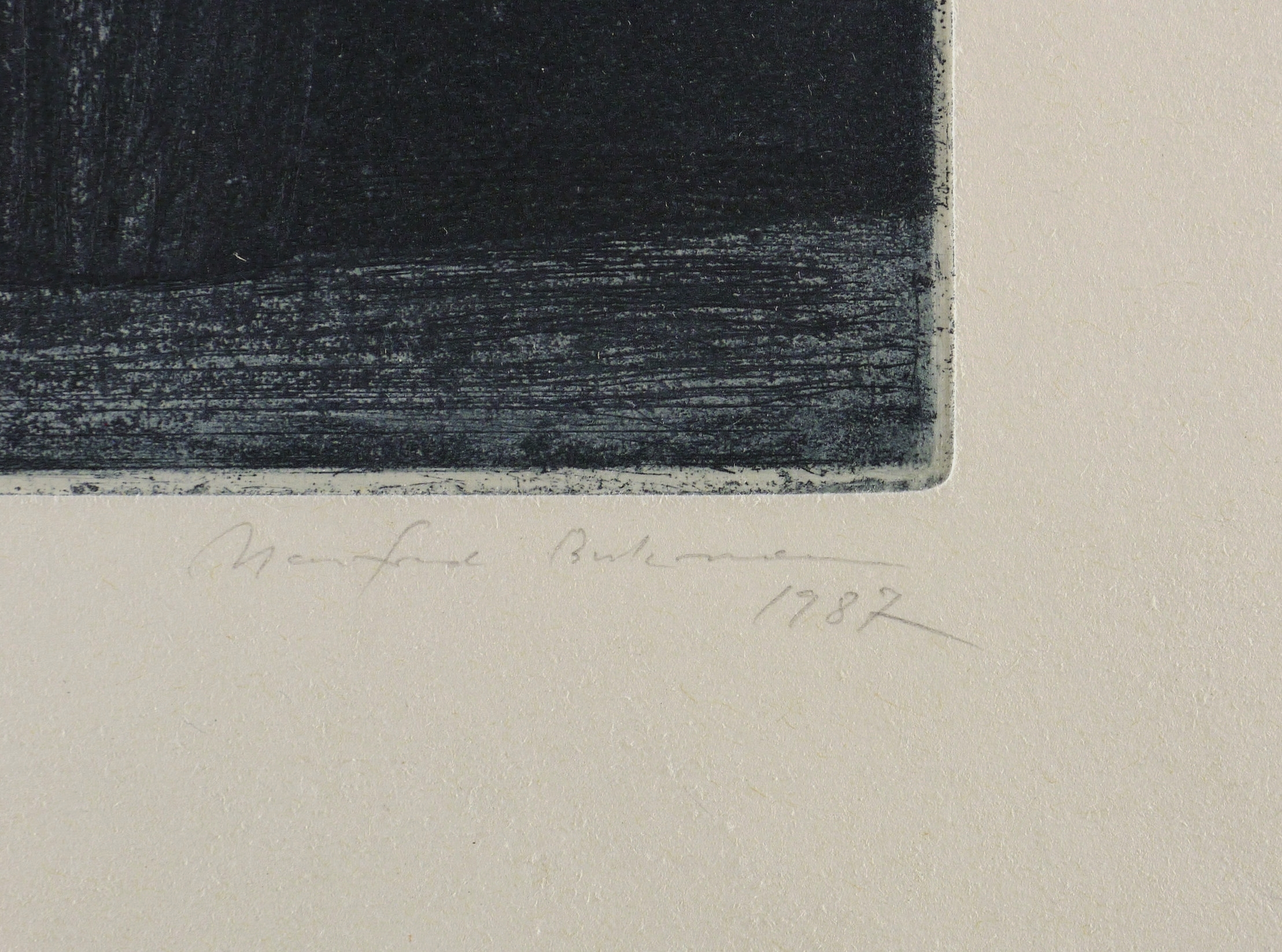 1987. Radierung / Aquatinta & Strichätzung, in Schwarzblau, auf weichem chamois Hahnemühle. – Originale Künstlergrafik, von Manfred Butzmann. – Probedruck. – 22,7 x 16,2 cm (Darstellung / Platte), 37 x 31 cm (Blatt).