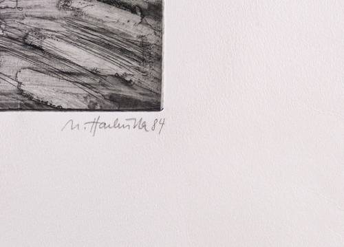 1984. Radierung / Aquatinta & Strichätzung, in Schwarz, mit Plattenton, auf hellchamois Hahnemühle. – Originale Künstlergrafik, von Ulrich Hachulla. – Künstlerexemplar (e.a.). – 19,9 x 23,8 cm (Darstellung / Platte), 40 x 54 cm (Blatt).