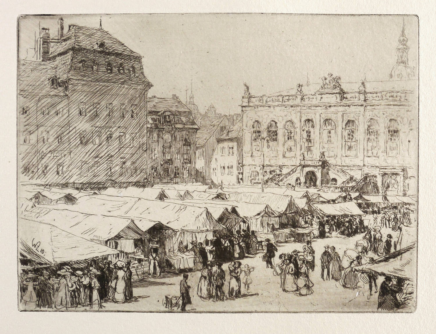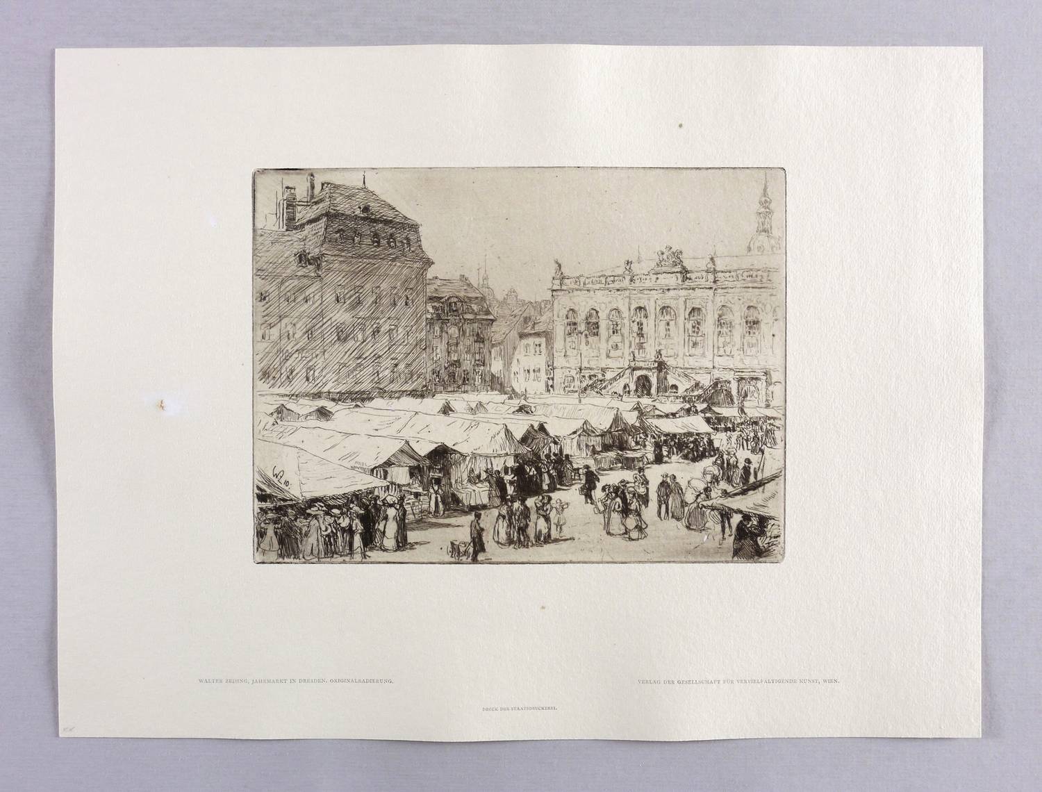 Aus: Die Graphischen Künste (Wien: Gesellschaft für Vervielfältigende Kunst 1912/1913), Bd. 35/36. – Unterhalb typografisch bezeichnet: ″WALTER ZEISING, JAHRMARKT IN DRESDEN″. Dazu Druckeradresse und Verlegeradresse. – Originalrandiges Exemplar. Papier mit kleinem Einschluss im linken Rand. Guter Zustand.