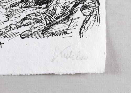 Alfred Kubin (1877 Leitmeritz - 1959 Zwickledt). Eigentlich Alfred Leopold Isidor Kubin. Österreichischer Grafiker und Illustrator. Ausbildung zum Fotografen bei einem Onkel in Klagenfurt. Frühe Beeinflussung durch den metaphysischen Pessimismus Artur Schopenhauers. 1898/99 der Besuch an der Königlichen Akademie in München bei Nikolaus Gysis, daneben andere private Zeichenschulen (z.B. bei Ludwig Schmidt-Reutte). 1899 inspiriert ihn Max Klingers Radierzyklus 'Paraphrase über den Fund eines Handschuhs' zu seiner ersten großen Schaffensphase bis 1903. Bekanntschaft mit Bruno Cassirer. 1909 Entstehung des phantastischen Romans 'Die andere Seite' mit eigenen Illustrationen. 1911 Mitglied der Künstlergruppe "Blauer Reiter". Er illustriert in seinem Leben ca. 60 Bücher, u.a. Dostojewski und Poe. Der frühe Tod der Mutter und die Spannungen mit dem Vater führten zu seelischen Krisen und andauernder Melancholie. Das Geheimnisvoll-Imaginative, das Unheimliche und Alptraumhafte sind typisch für sein Werk und erinnern an Goya und Redon.