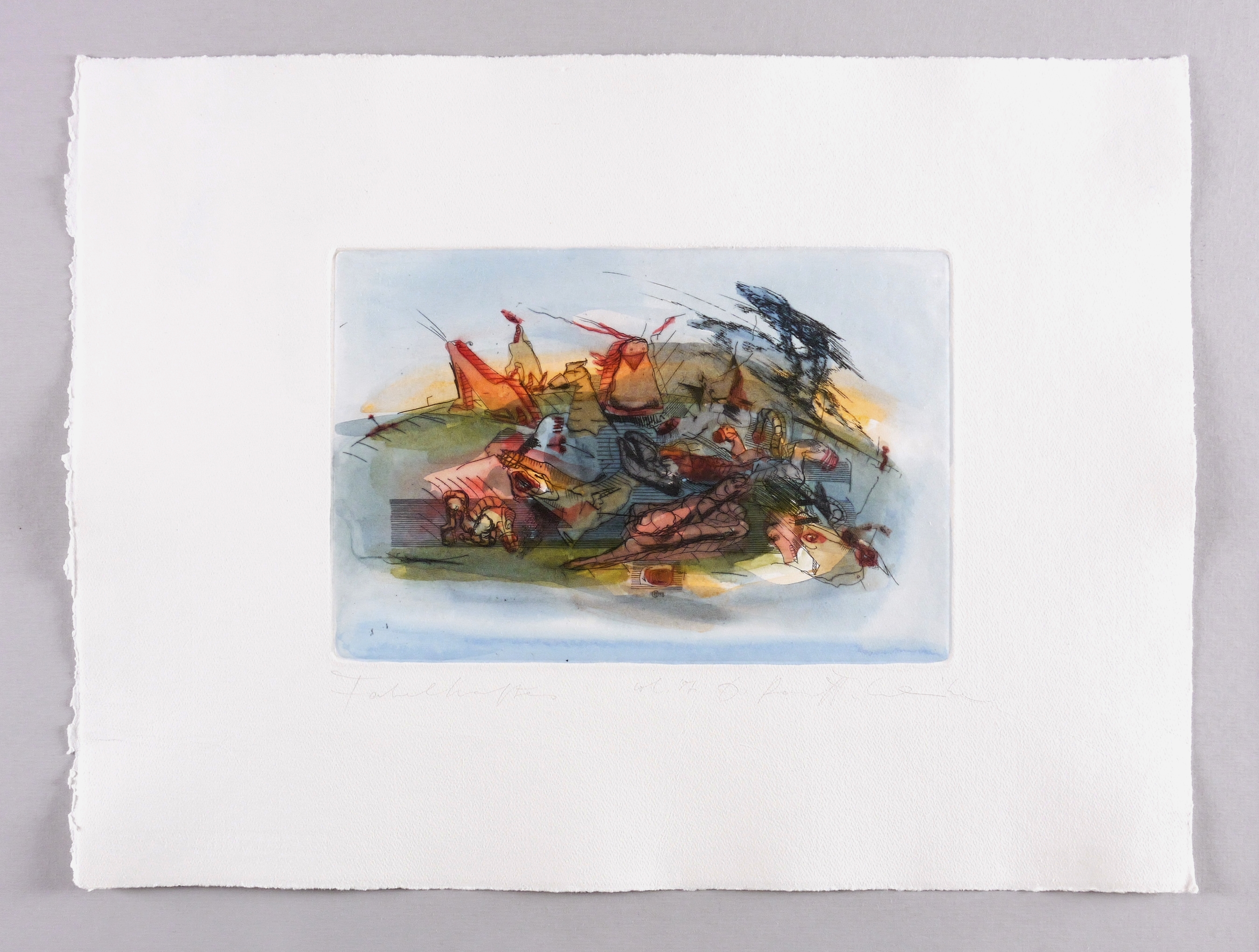 Rechts unten in Bleistift signiert: ″D. Ranft-Schinke″. Links Titel: ″Fabelhaftes″. Mittig bezeichnet und datiert: ″col. 87″. Wasserzeichen der Hahnemühle. – Farbfrisch und schön erhalten. Sehr guter Zustand.