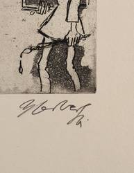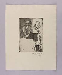 1961. Radierung / Aquatinta & Strichätzung, in Schwarz, auf festem gelbem Velinkarton. – Originale Künstlergrafik, von Herbert Sandberg. – 16,8 x 11,7 cm (Darstellung / Platte), 32 x 25 cm (Blatt).