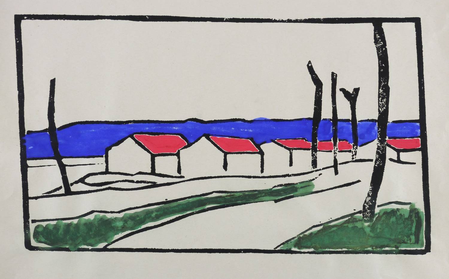 1975. Lithografie / Pinsellithografie, in Schwarz, aquarelliert, auf glattem gelblichem Velin. – Originale Künstlergrafik, von Albert Wigand. – 39 x 54 cm (Blatt), 25,5 x 43,5 cm (Darstellung / Druckbild).