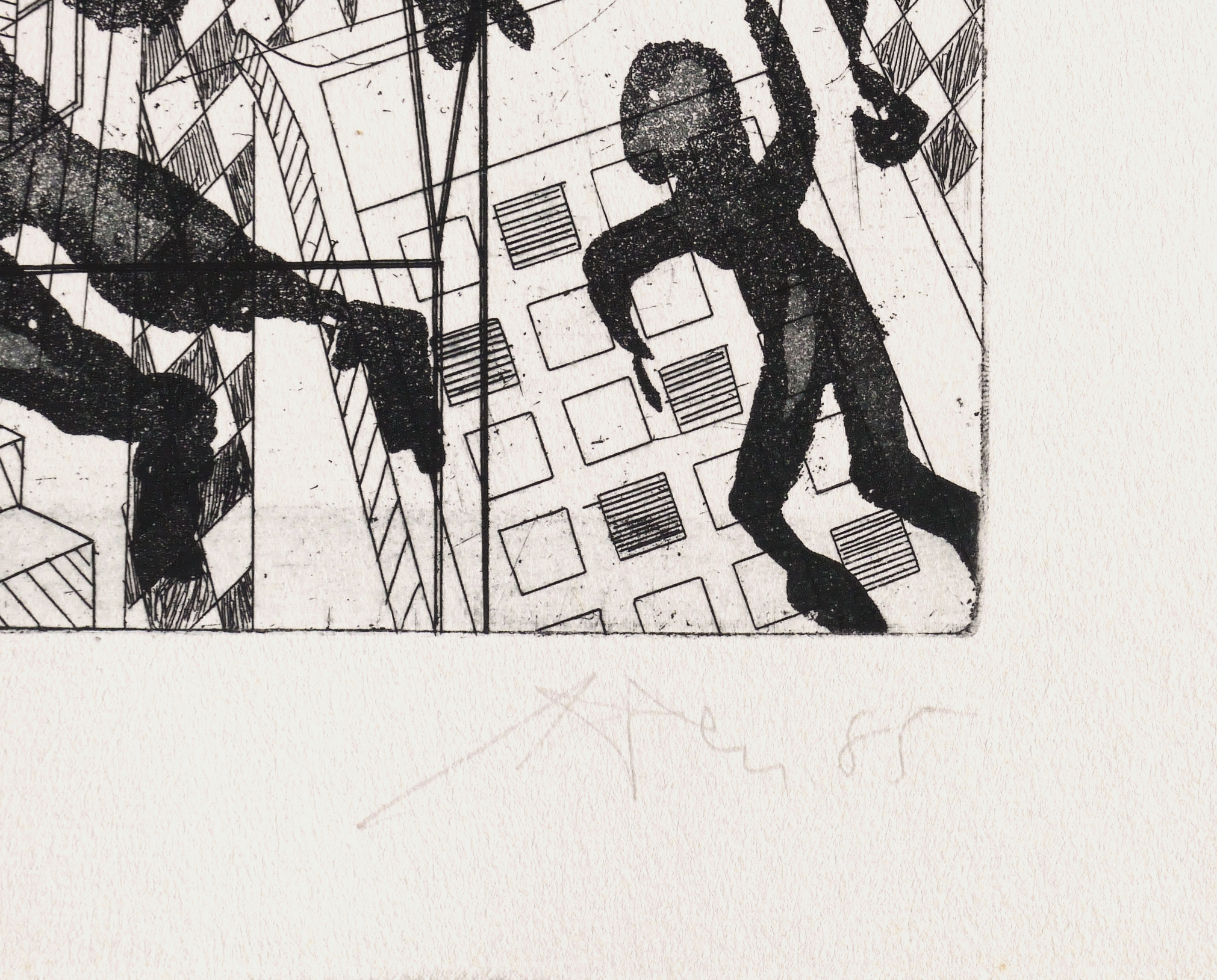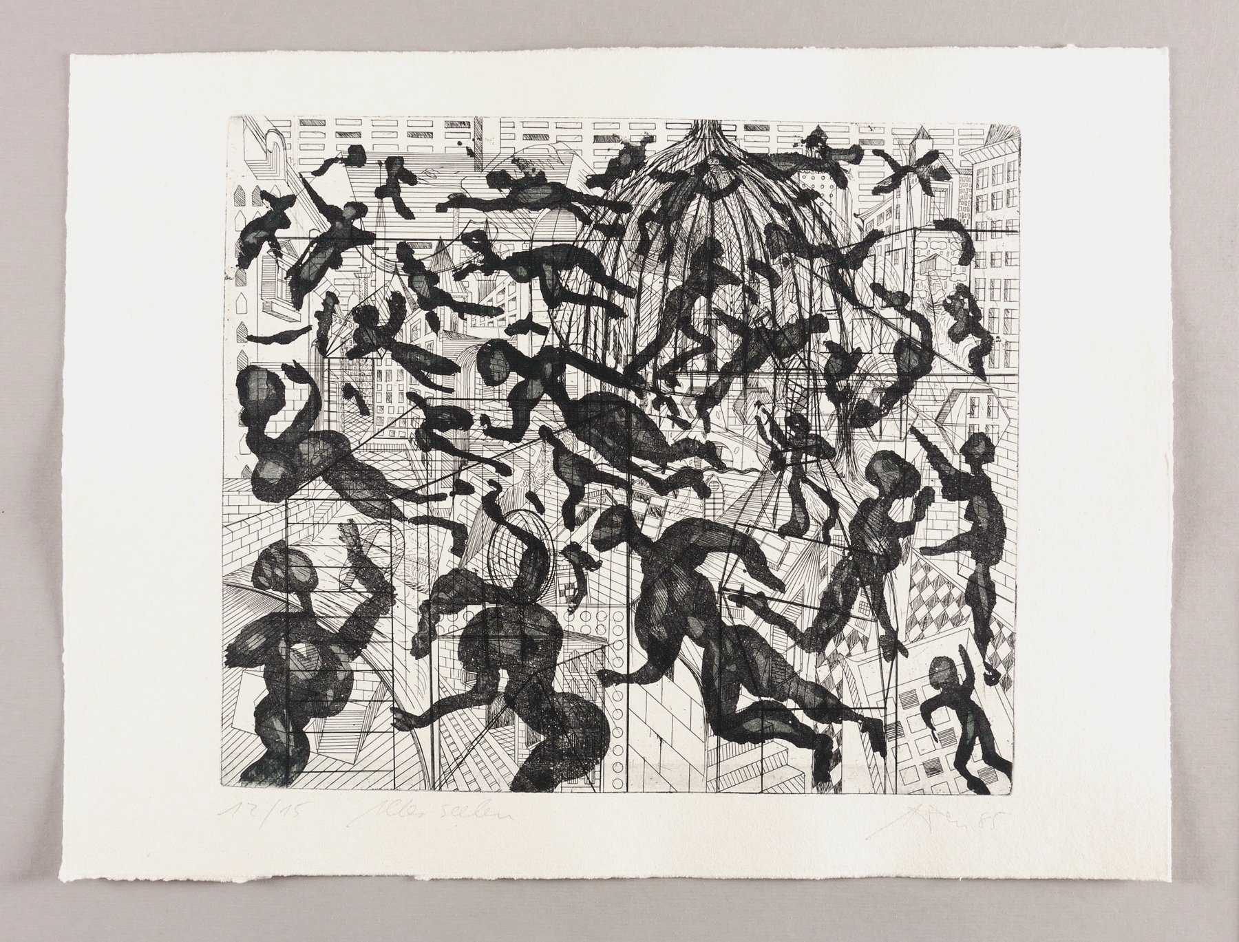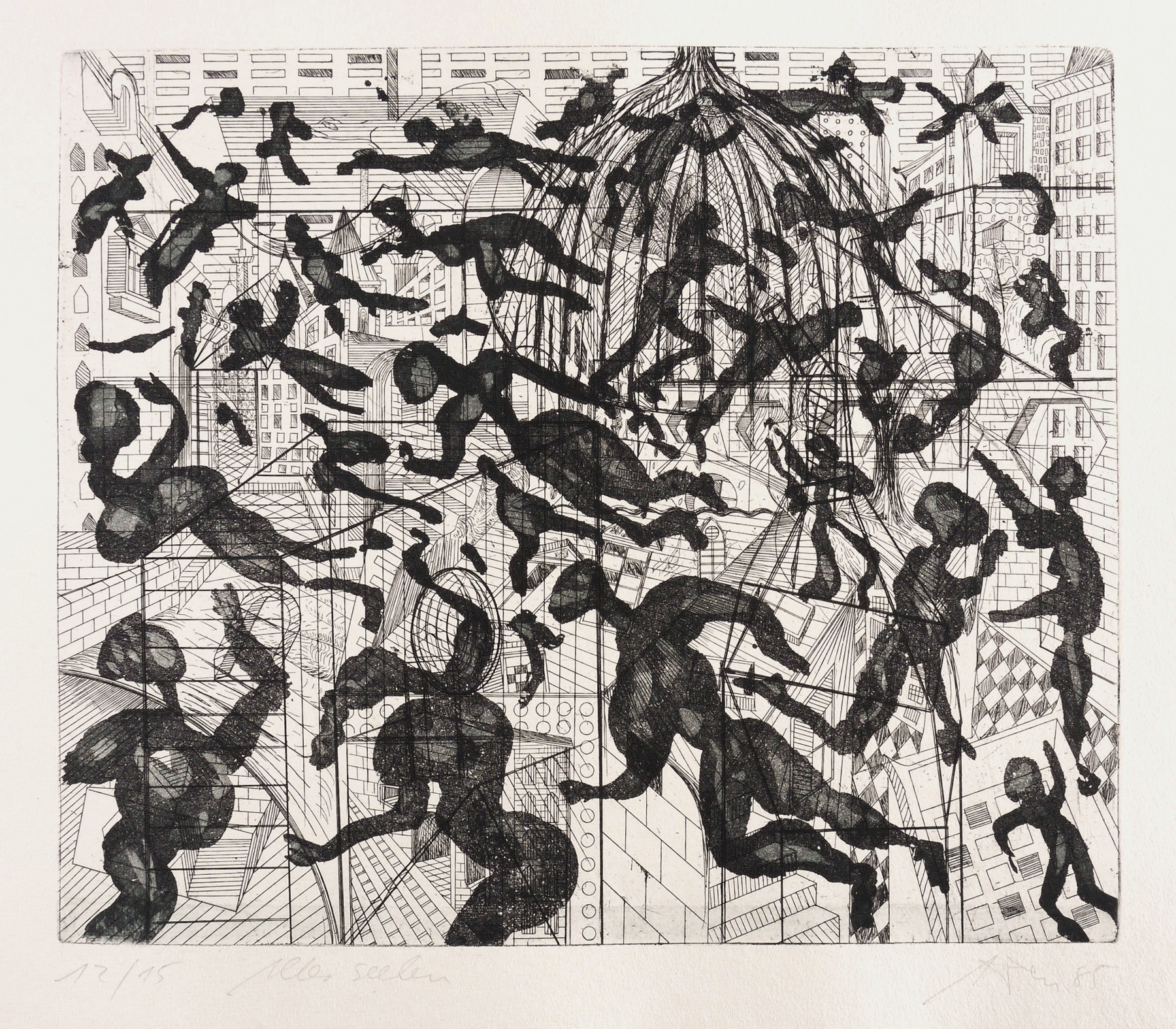 1985. Radierung / Strichätzung & Aquatinta, in Schwarz, auf kräftigem hellchamois Bütten. – Originale Künstlergrafik, von Andreas Dress. – Auflage Exemplar Nr. 12/15. – 31,0 x 36,4 cm (Darstellung / Platte), 38 x 51 cm (Blatt).