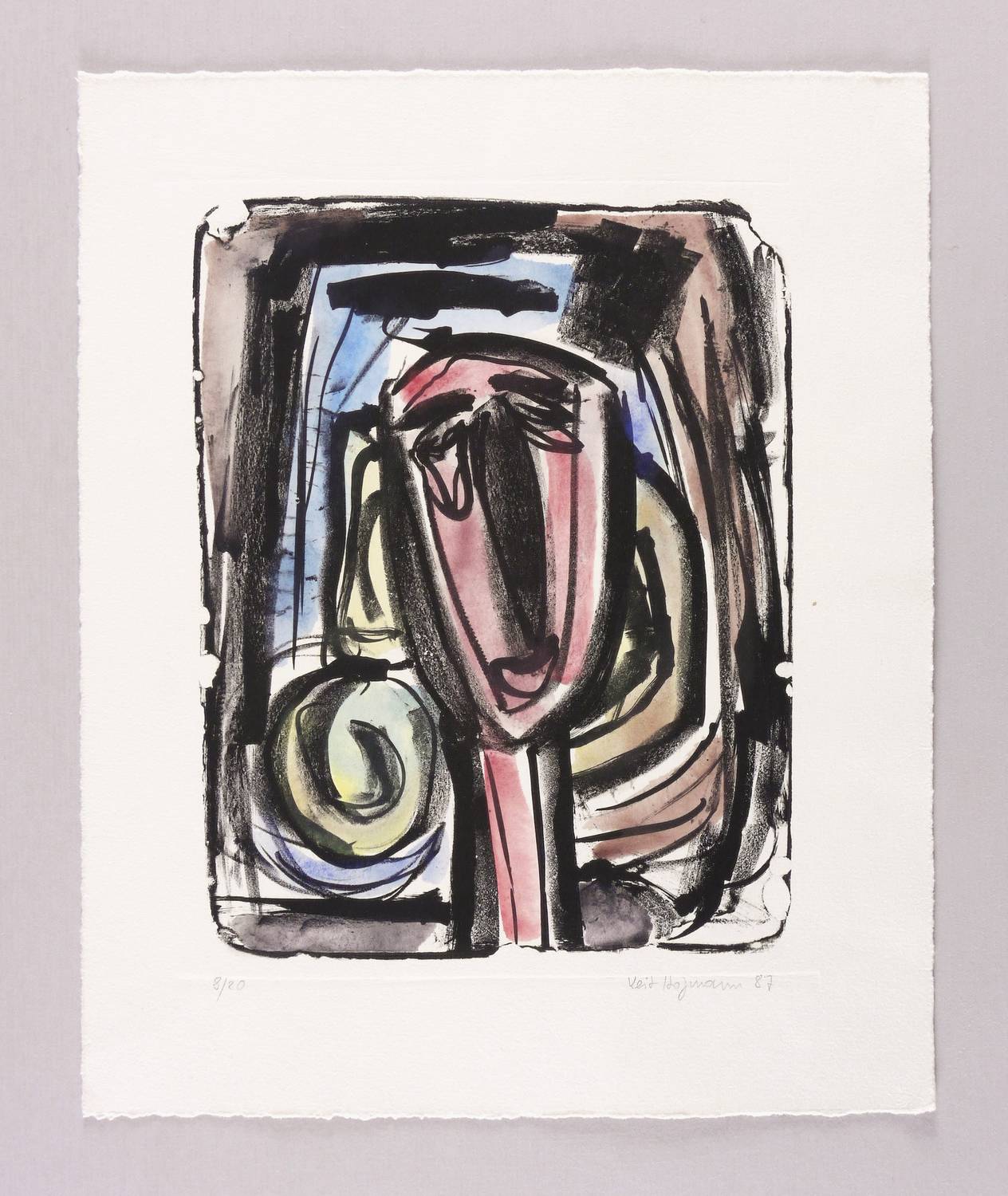 1987. Lithografie / Kreidelithografie, in Schwarz, aquarelliert, auf hellchamois Hahnemühle. – Originale Künstlergrafik, von Veit Hofmann. – Auflage Exemplar Nr. 8/20. – 23,8 x 18,5 cm (Darstellung / Druckbild), 33 x 27 cm (Blatt).