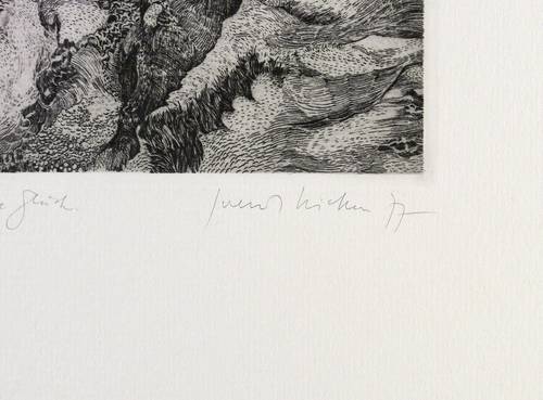1977. Radierung / Strichätzung, in Schwarz, auf hellchamois Weißenborn. – Originale Künstlergrafik, von Gerenot Richter. – Auflage Exemplar Nr. 2/15. – 13,0 x 17,7 cm (Darstellung / Platte), 41 x 37 cm (Blatt).