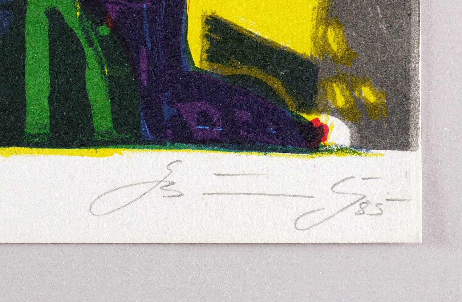 1985. Farblithografie / Kreide- & Pinsellithografie, in 5 Farben, auf hartem hellchamois Weißenborn. – Originale Künstlergrafik, von Gottfried Bräunling. – Auflage Exemplar Nr. 4/12. – 37,5 x 60,0 cm (Darstellung / Druckbild), 40 x 60 cm (Blatt).