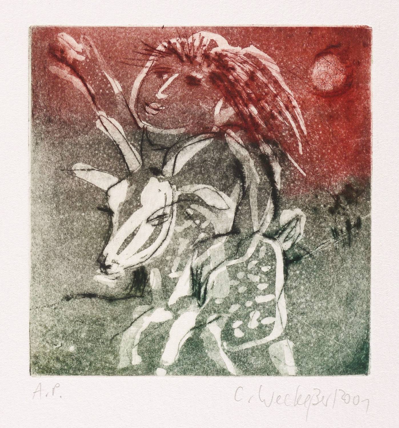2001. Farbradierung / Aquatinta & Kaltnadel, in Moosgrün & Rostrot, auf hellchamois Velinkarton. – Originale Künstlergrafik, von Carla Weckeßer. – Künstlerexemplar (e.a.). – 10,0 x 9,8 cm (Darstellung / Platte), 17 x 13 cm (Blatt).