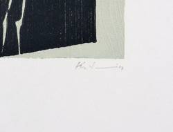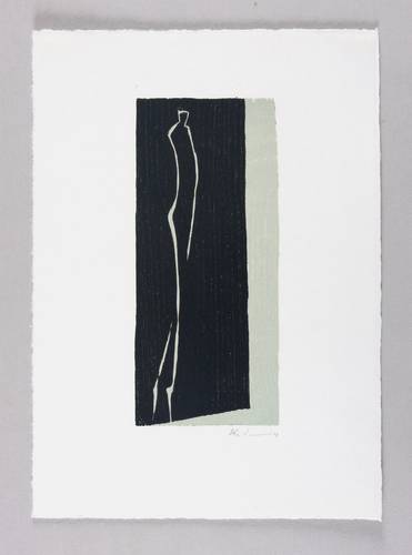 Um 2000. Farbholzschnitt, in hellgaru & Schwarz, auf hellem Velin. – Originale Künstlergrafik, von Peter Zaumseil. – 20,0 x 8,8 cm (Darstellung / Druckstock), 30 x 22 cm (Blatt).