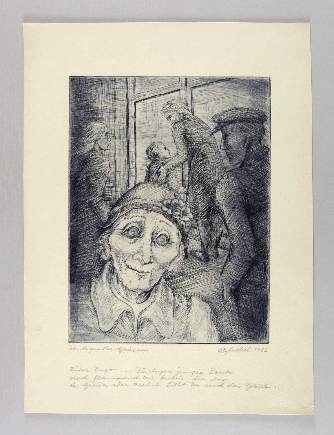 Rechts unten in Bleistift signiert und datiert: ″Elly Reichel 1982″. Links Titel: ″Die Augen der Greisin″. Unterhalb Ziitat: ″Victor Hugo ... Die Augen junger Leute sind flammend wie Rubin, im Aug des Greises aber siehst Licht Du und das Glück... – Blattecken bestoßen. Blattrand mit leichten Fleckchen und Verschmutzungen. Papier altersbedingt leicht gegilbt. Insgesamt noch guter Zustand.