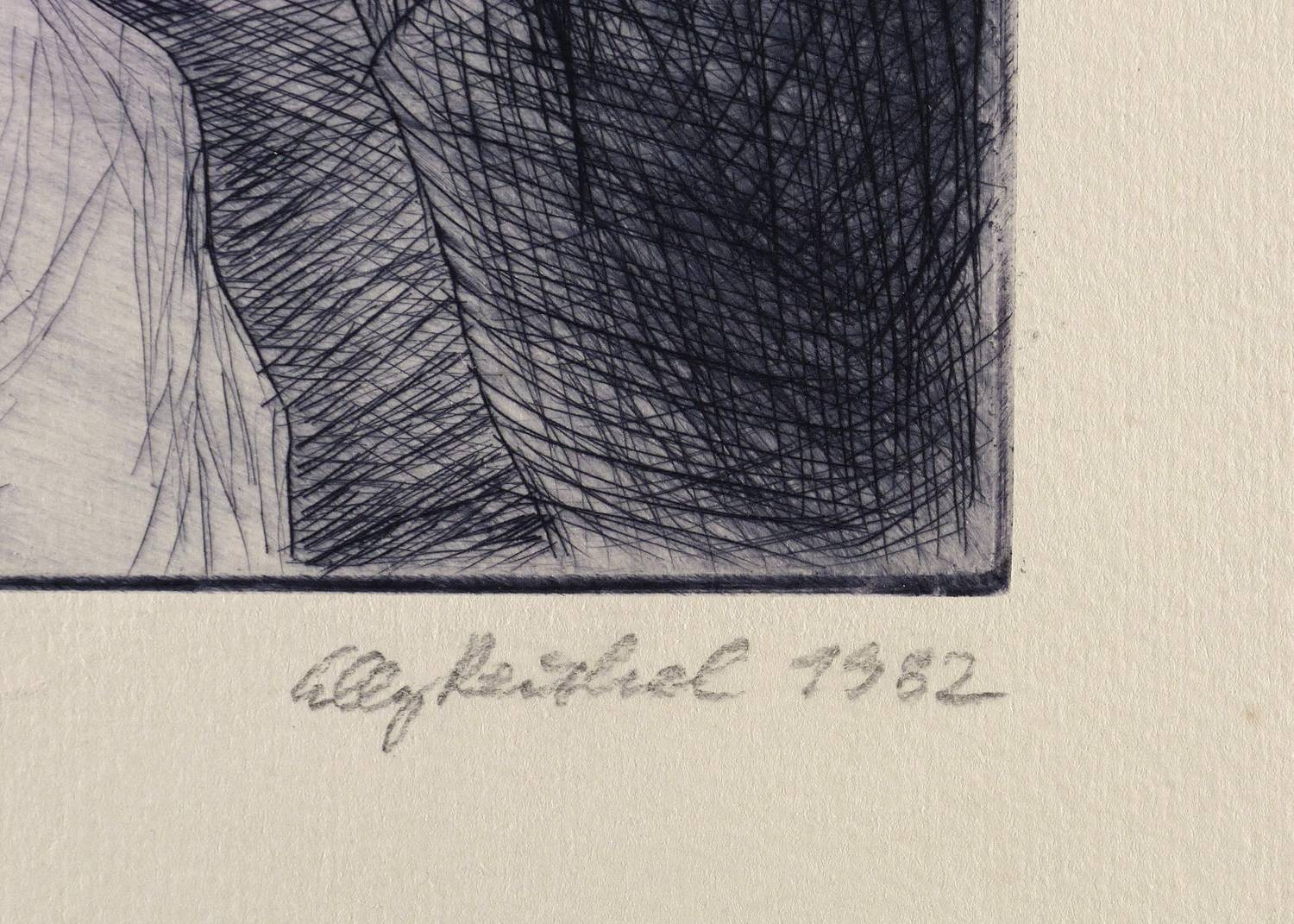 1982. Radierung / Kaltnadel, in Schwarzblau, auf gelbem Weißenborn. – Originale Künstlergrafik, von Elly Reichel. – 32,6 x 24,7 cm (Darstellung / Platte), 48 x 36 cm (Blatt).