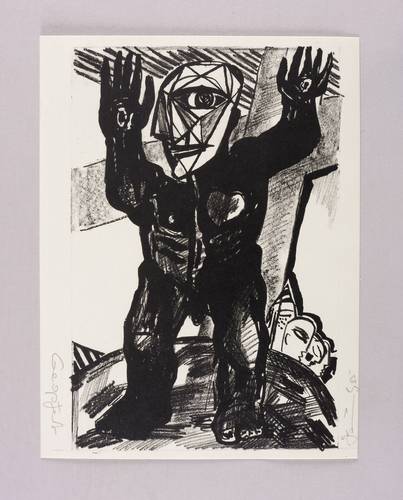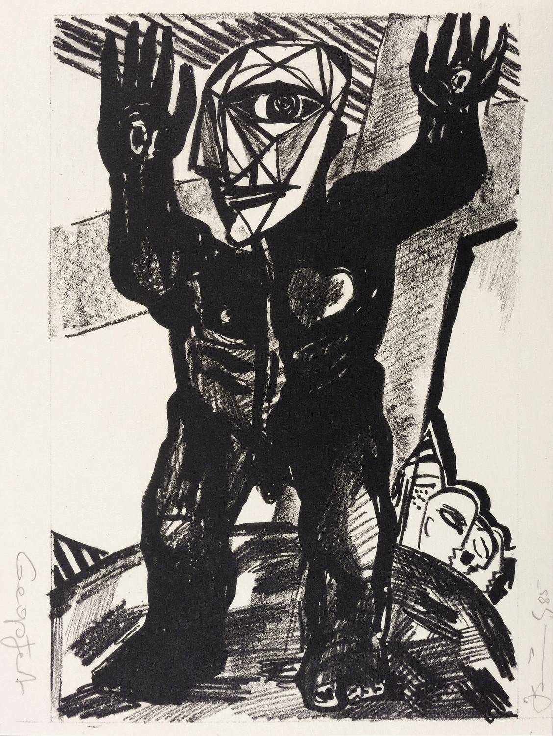 Unten rechts in Bleistift signiert und datiert: ″GBräunling 85″. Links Titel: ″Geopfert″. – Rückseitig leichte Montagespuren. Sonst tadellos. Sehr guter Zustand.