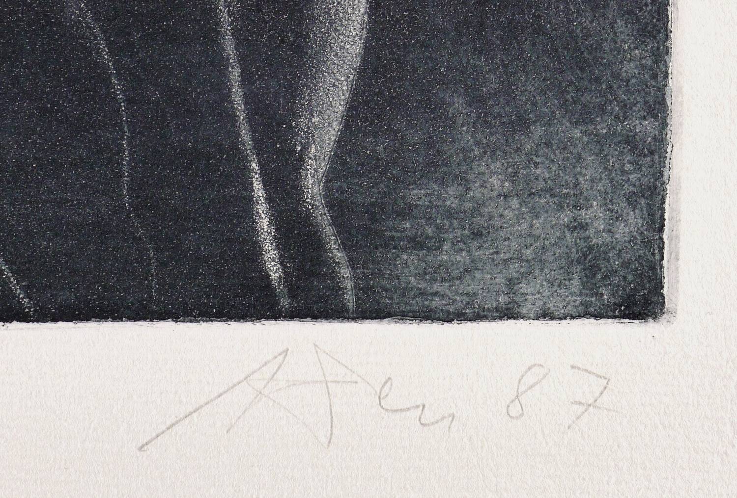 1987. Radierung / Aquatinta & Mezzotinto, in Schwarz, auf weichem hellchamois Hahnemühle. – Originale Künstlergrafik, von Andreas Dress. – Auflage Exemplar Nr. V/XII. – 30,5 x 42,8 cm (Darstellung / Druckbild), 40 x 54 cm (Blatt).