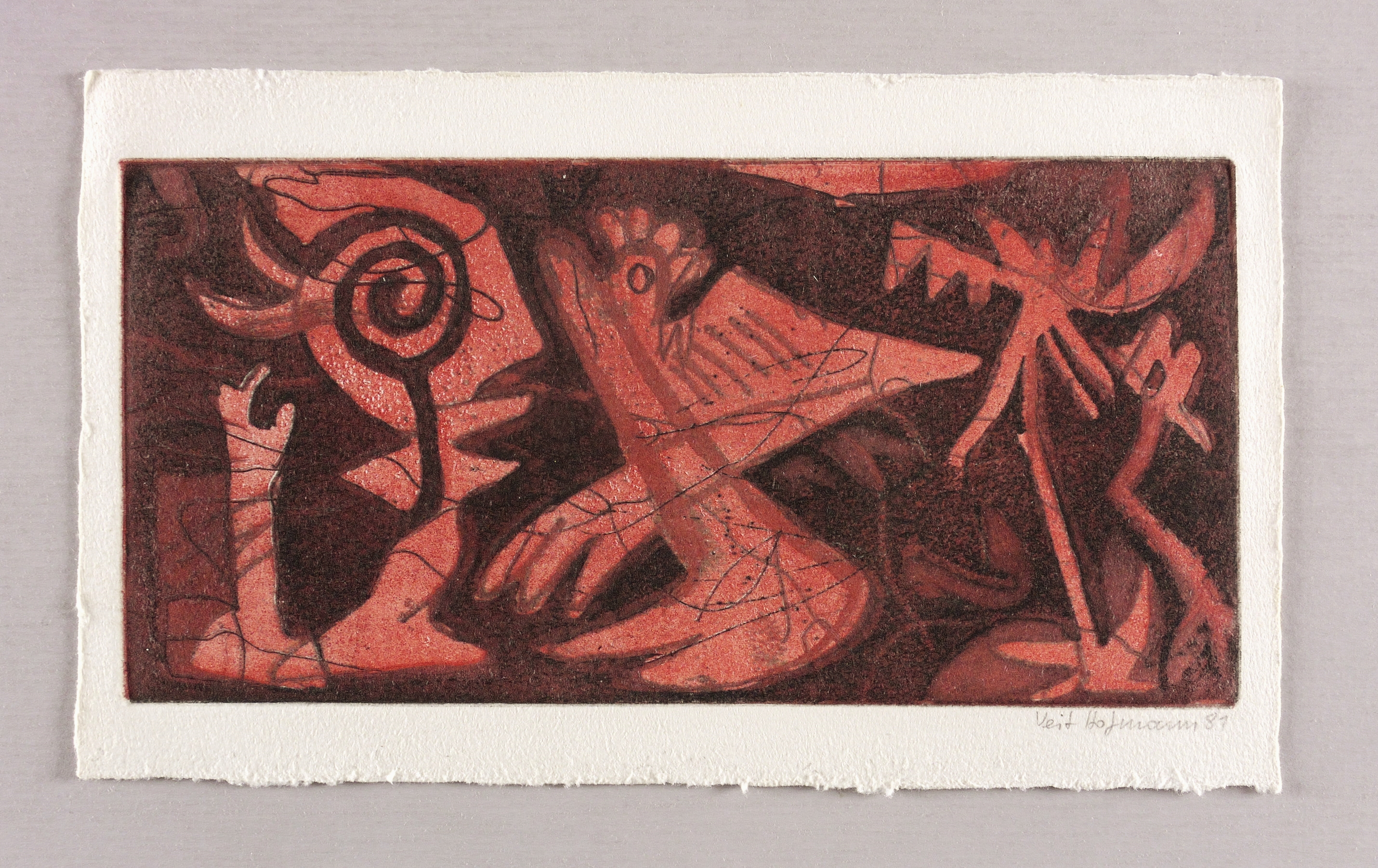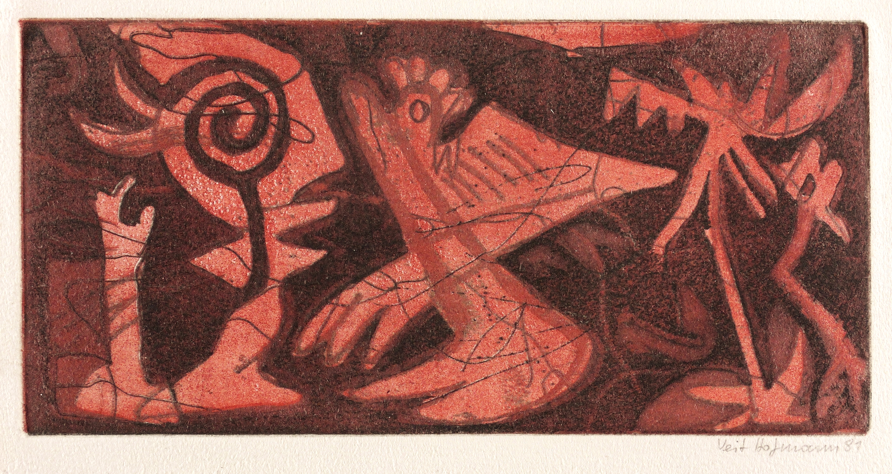 1981. Farbradierung / Aquatinta & Reservage, in Hellrot, Hellgrün & Schwarz, auf Bütten. – Originale Künstlergrafik, von Veit Hofmann. – 10,1 x 20,5 cm (Darstellung / Platte), 14 x 22 cm (Blatt).