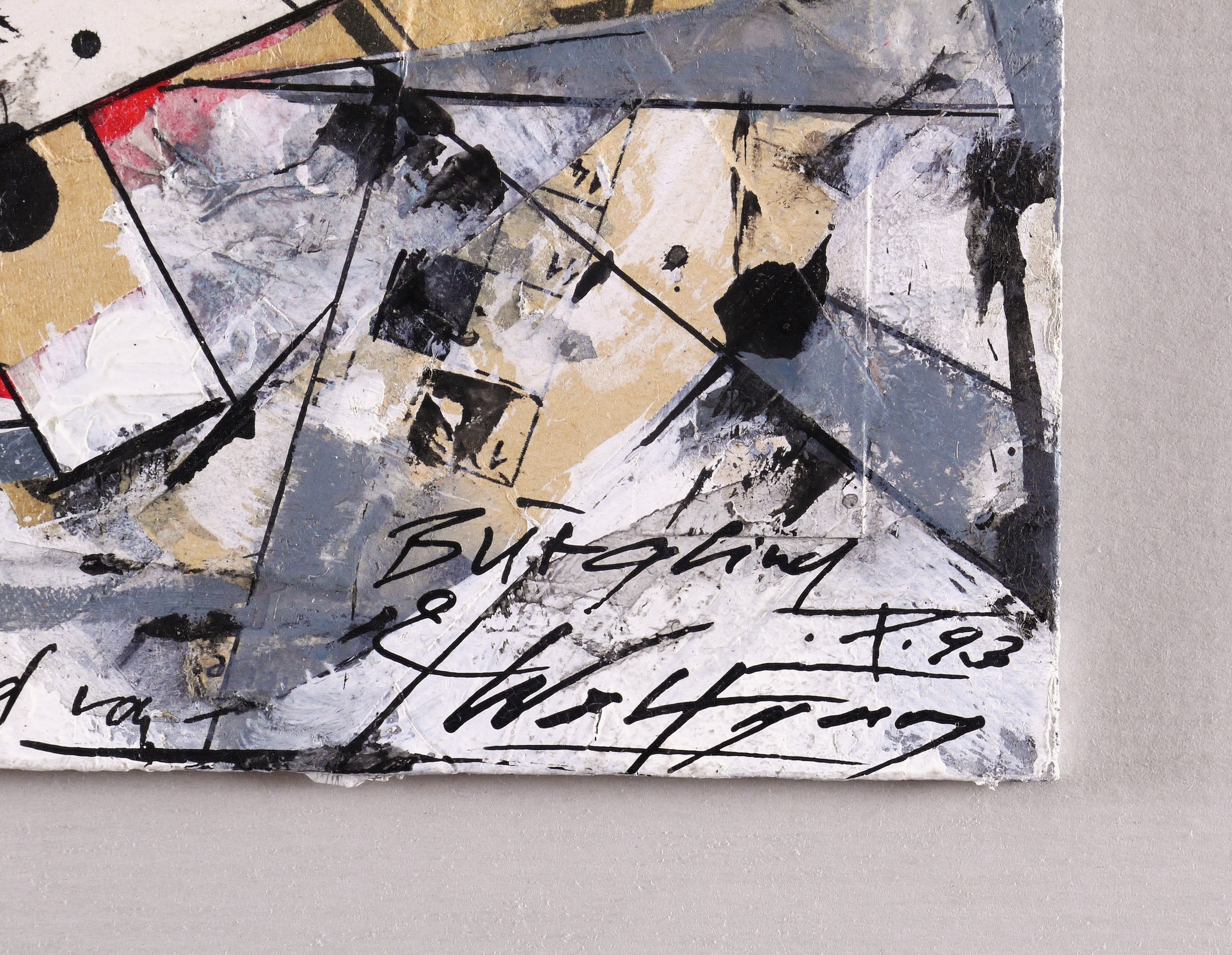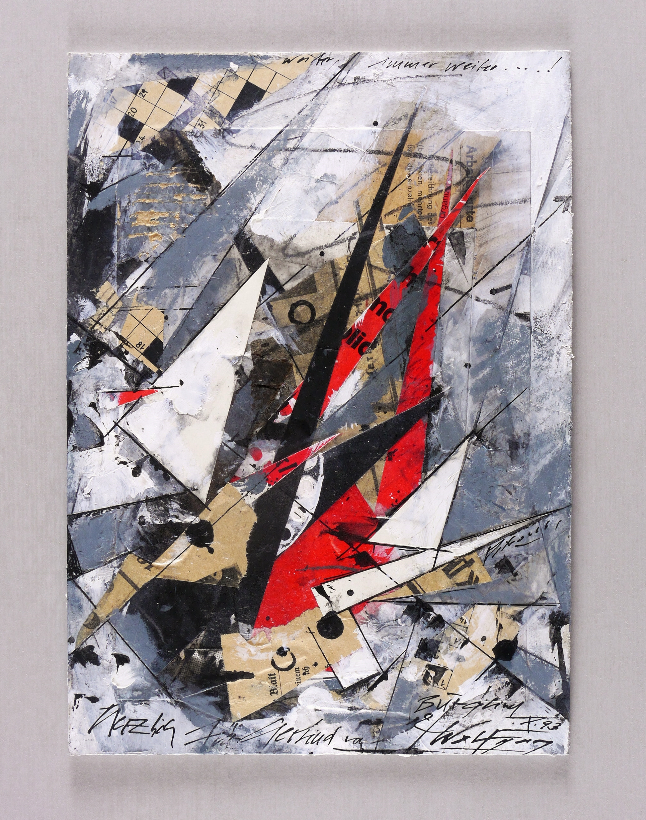 1993. Collage / Papiercollage, darüber Tusche & Deckweiß, auf Papptafel. – Tafelbild, von Wolfgang Petrovsky. – Unikat. – 26,0 x 18,5 cm (Darstellung / Tafel).