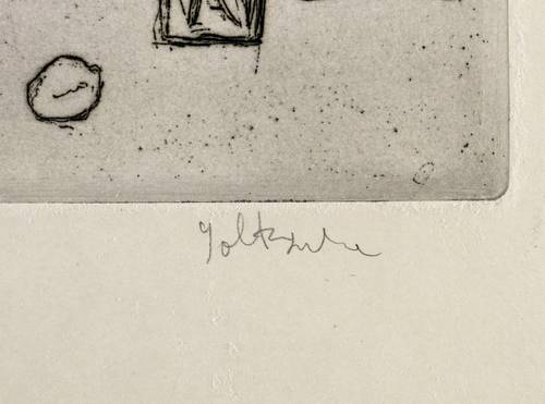 1960-1970. Radierung / Reservage, in Schwarz, mit Plattenton, auf gelbem Velinkarton. – Originale Künstlergrafik, von Dieter Goltzsche. – 14,2 x 10,9 cm (Darstellung / Platte), 21 x 20 cm (Blatt).